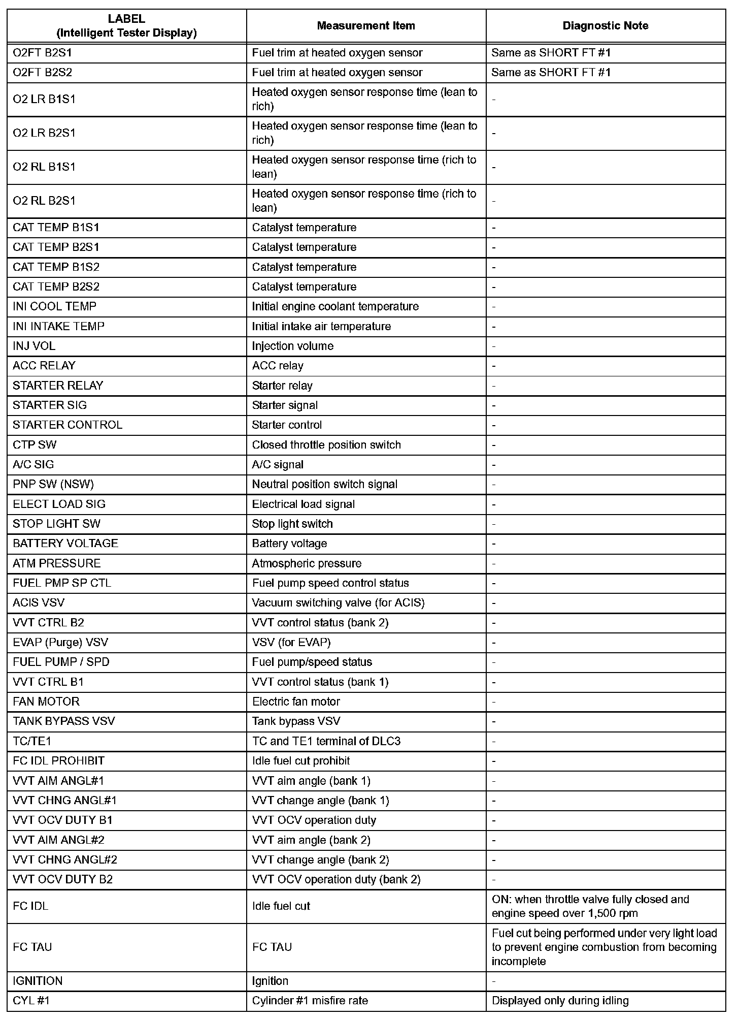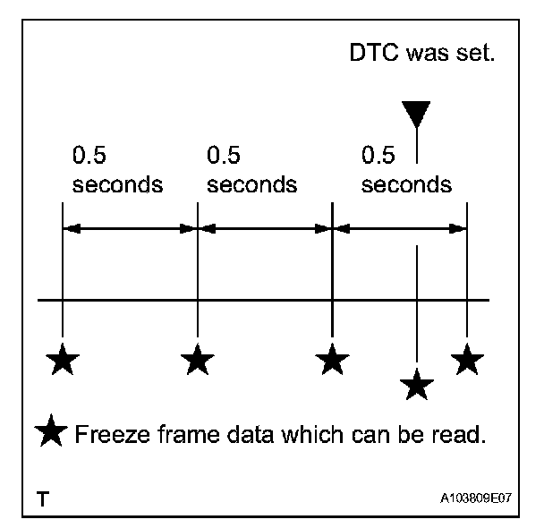 HINT: If it is impossible to replicate the problem even though a DTC is detected, confirm the freeze frame data. The ECM records engine conditions in the form of freeze frame data every 0.5 seconds. Using the intelligent tester, five separate sets of freeze frame data, including the data values at the time when the DTC was set, can be checked.
