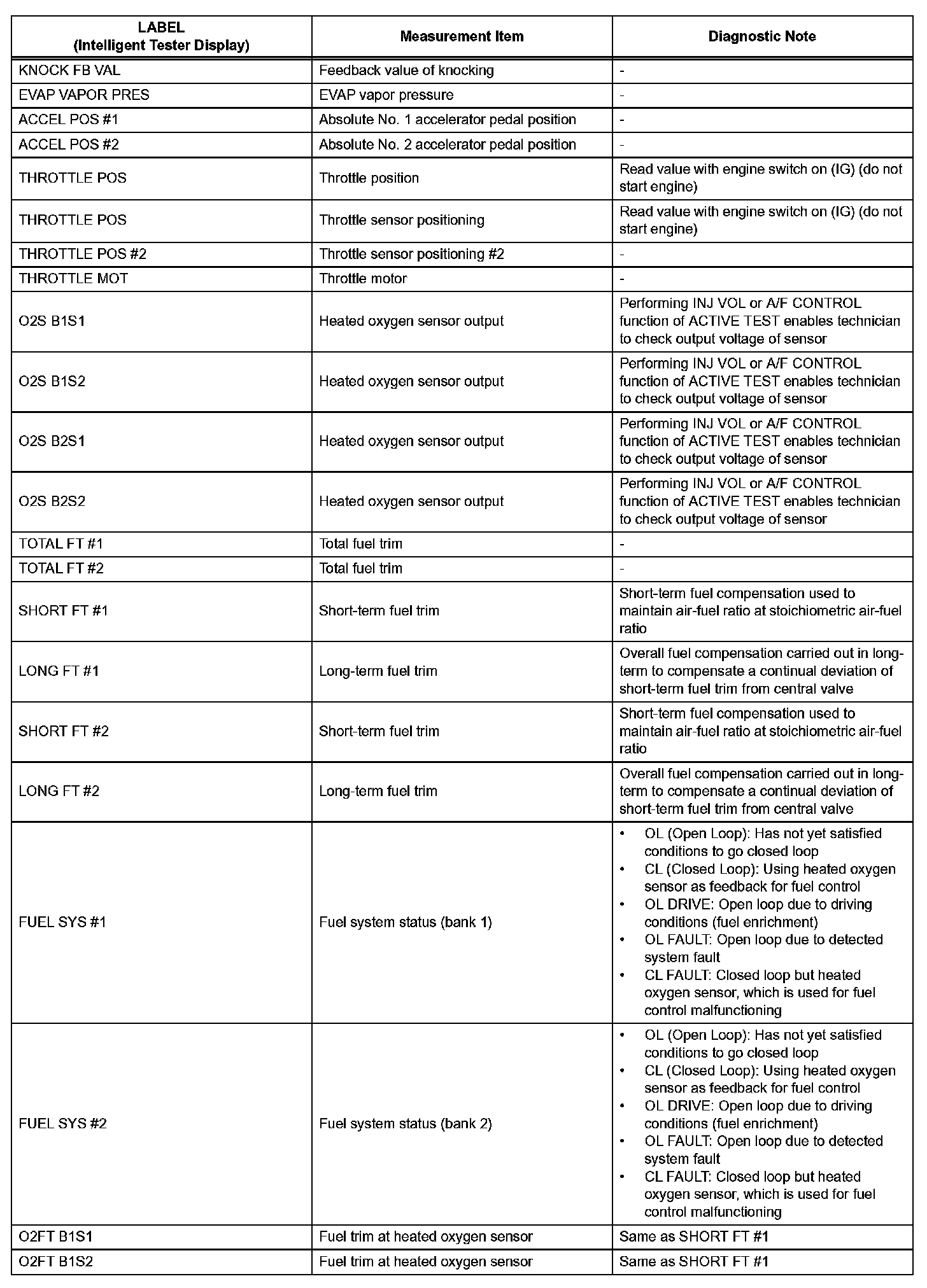 Freeze frame data records the engine conditions (fuel system, calculated load, engine coolant temperature, fuel trim, engine speed, vehicle speed, etc.) when a malfunction is detected. When troubleshooting, freeze frame data can help determine if the vehicle was running or stopped, if the engine was warmed up or not, if the air-fuel ratio was Lean or Rich, and other data from the time the malfunction occurred.