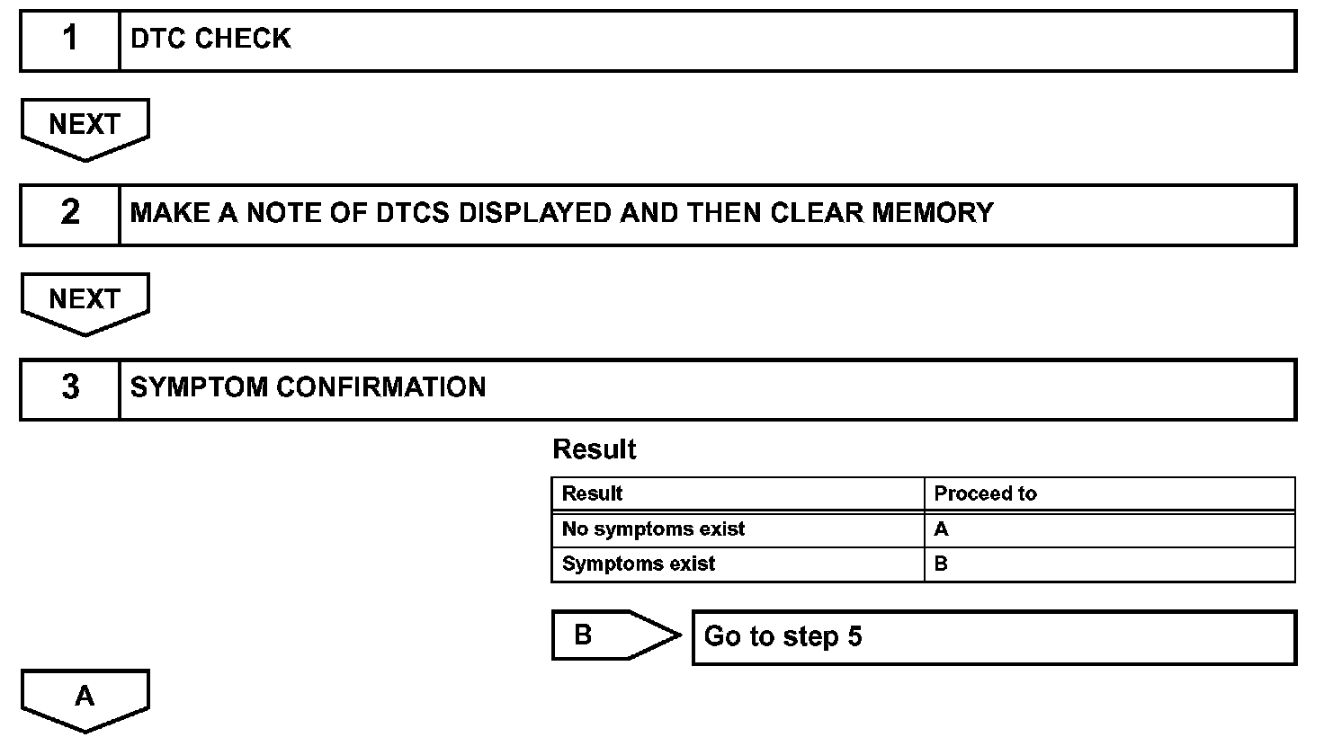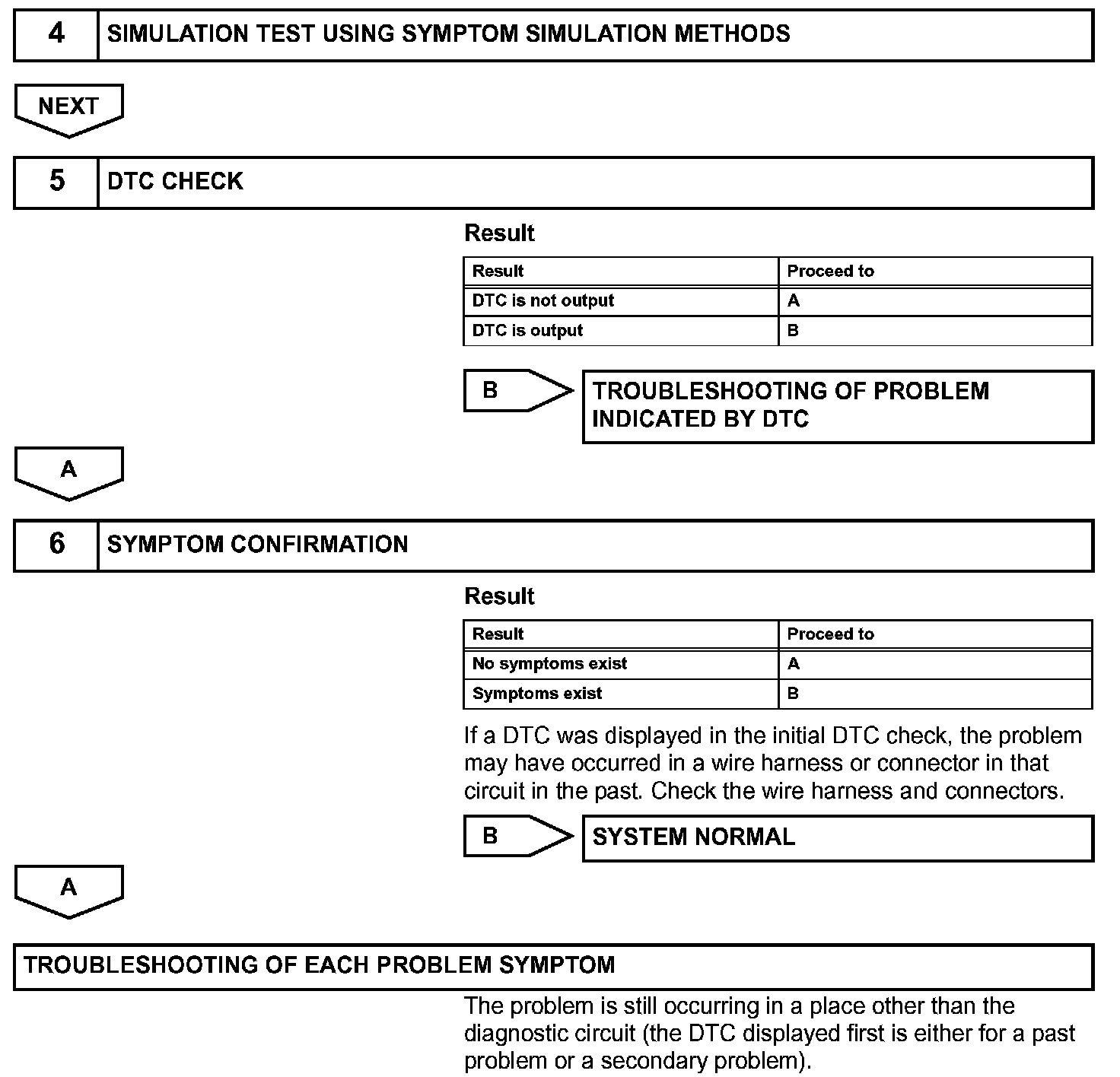 - In the DTC check, it is very important to determine whether the problem indicated by the DTC is either: 1) still occurring, or 2) occurred in the past but has since returned to normal. In addition, the DTC should be compared to the problem symptom to see if they are related. For this reason, DTCs should be checked before and after confirmation of symptoms (i.e., whether or not problem symptoms exist) to determine current system conditions, as shown in the flowchart.