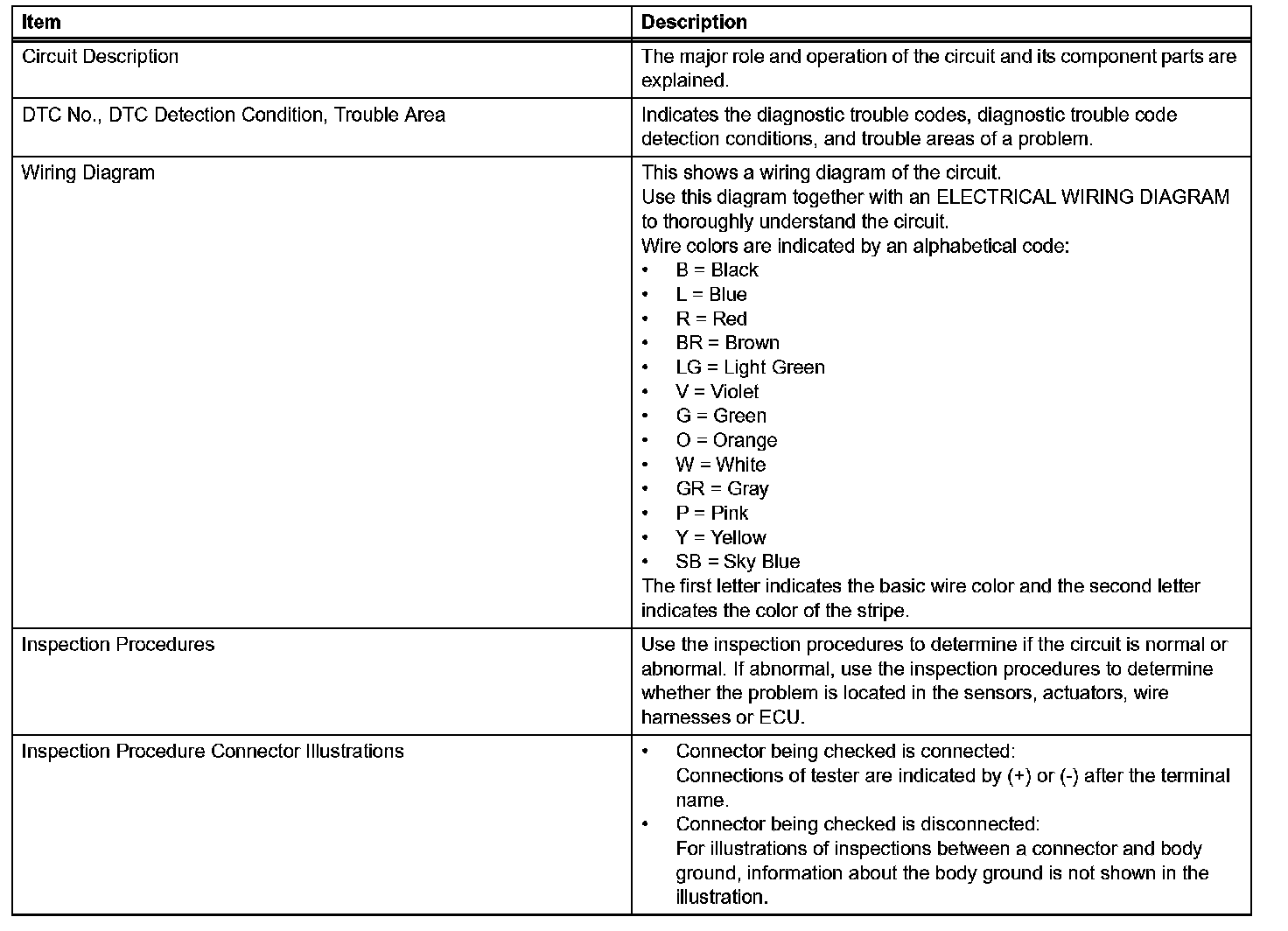 A description of the main areas of each circuit inspection is shown in the table.
