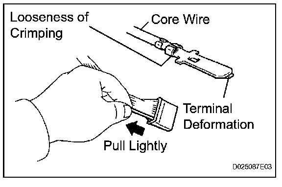 2. Checking when a connector is disconnected: Check by pulling the wire harness lightly from the backside of the connector. Look for unlatched terminals, missing terminals, loose crimps or broken conductor wires. Check visually for corrosion, metallic or foreign matter and water, and bent, rusted, overheated, contaminated, or deformed terminals.