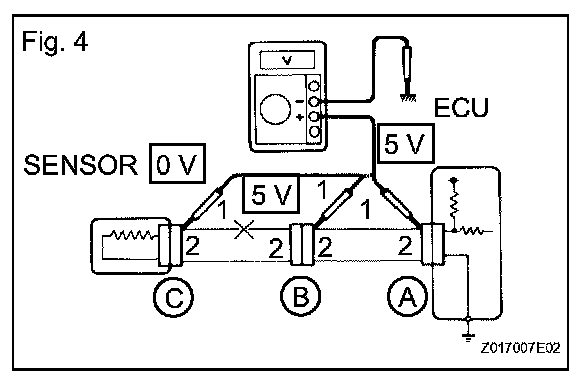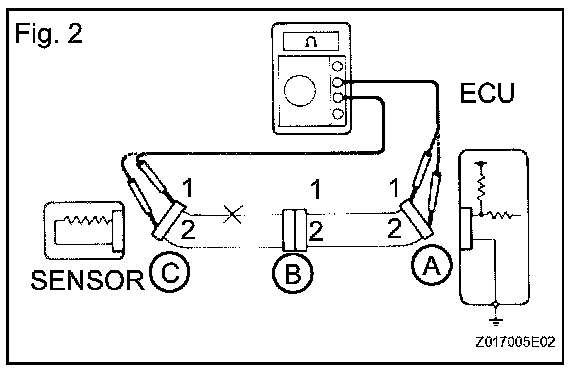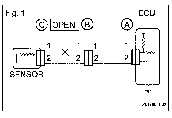 a. For an open circuit in the wire harness in Fig. 1, check the resistance or voltage, as described.
