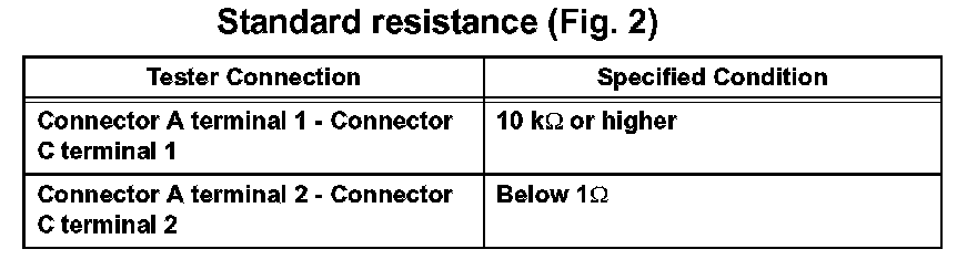 HINT: Measure the resistance while lightly shaking the wire harness vertically and horizontally. If the results match the examples above, an open circuit exists between terminal 1 of connector A and terminal 1 of connector C.