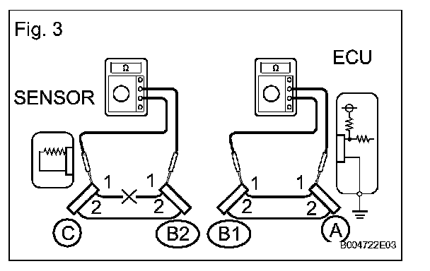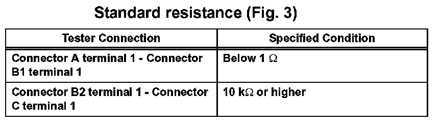 If the results match the examples above, an open circuit exists in the wire harness between terminal 1 of connector B and terminal 1 of connector C.