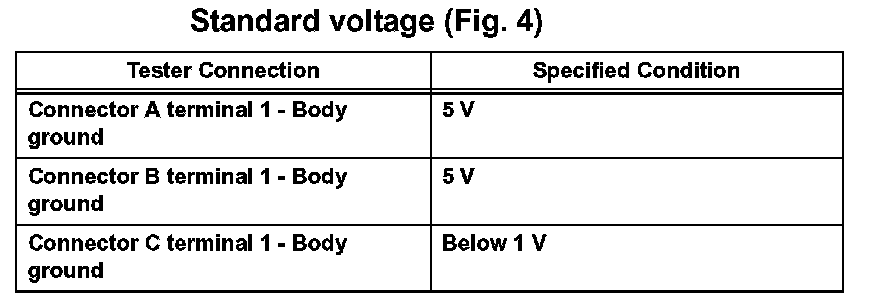 1. In a circuit in which voltage is applied to the ECU connector terminal, an open circuit can be checked by conducting a voltage check. With each connector still connected, measure the voltage between the body ground and these terminals (in this order): 1) terminal 1 of connector A, 2) terminal 1 of connector B, and 3) terminal 1 of connector C.