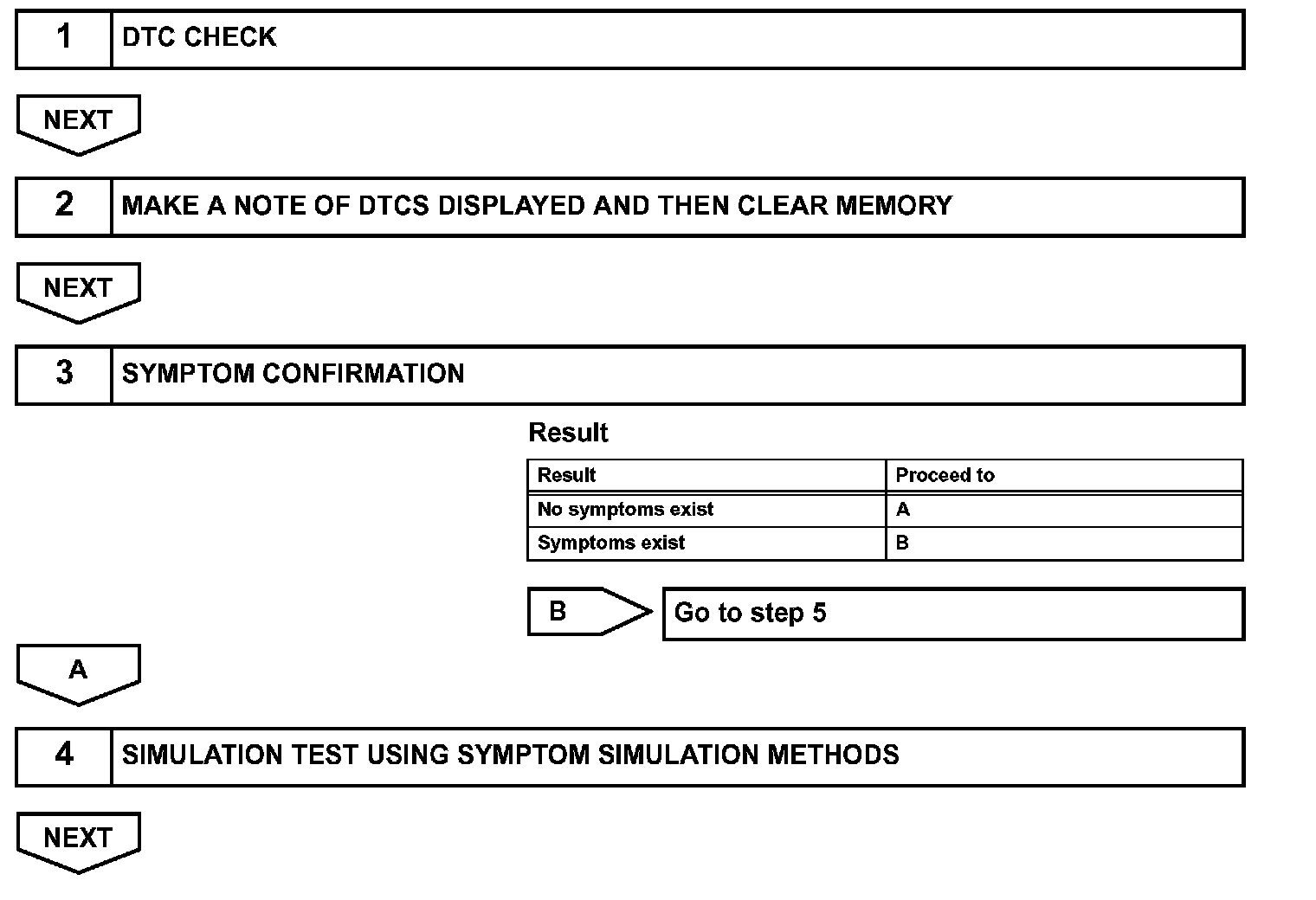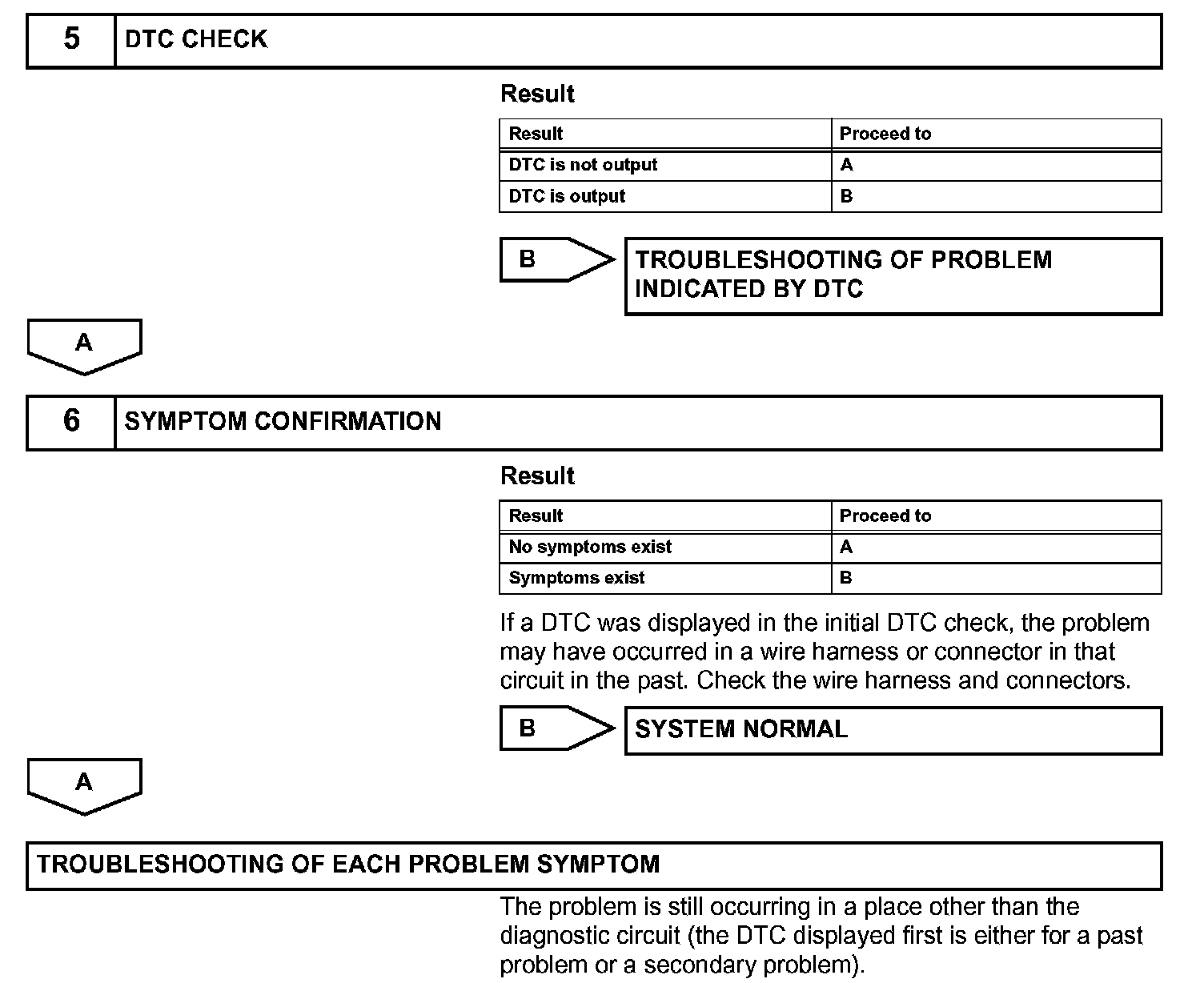 - In the DTC check, it is very important to determine whether the problem indicated by the DTC is either: 1) still occurring, or 2) occurred in the past but has since returned to normal. In addition, the DTC should be compared to the problem symptom to see if they are related. For this reason, DTCs should be checked before and after confirmation of symptoms (i.e., whether or not problem symptoms exist) to determine current system conditions, as shown in the flowchart.