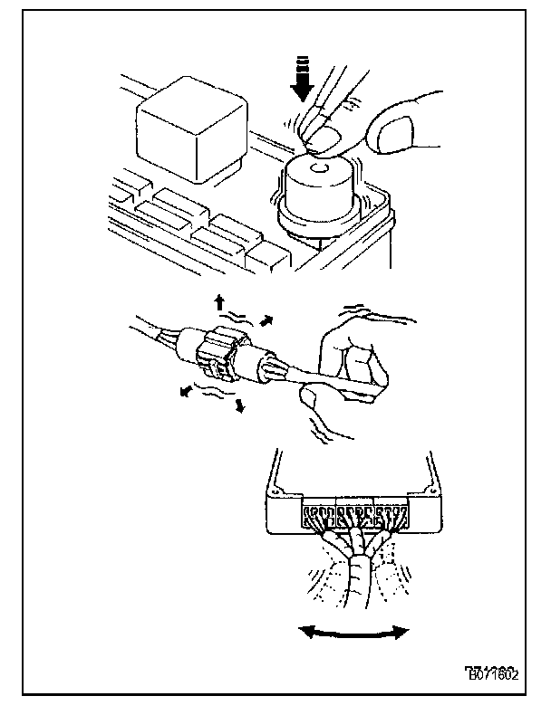 With a problem that only occurs when the engine is cold or as a result of vibration caused by the road during driving, the problem can never be determined if the symptoms are being checked on a stationary vehicle or on a vehicle with a warmed up engine. Vibration, heat or water penetration (moisture) is difficult to reproduce. The symptom simulation tests below are effective substitutes for the conditions and can be applied on a stationary vehicle.
