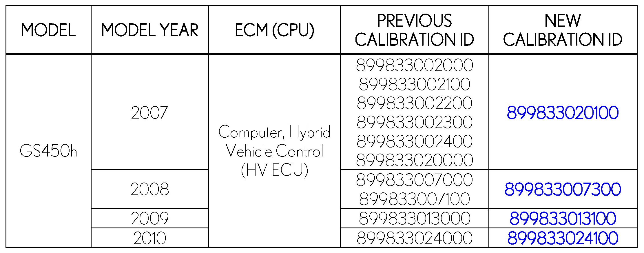 - Calibration ID(s) [Refer to the Calibration Identification Chart for the NEW CALIBRATION ID]