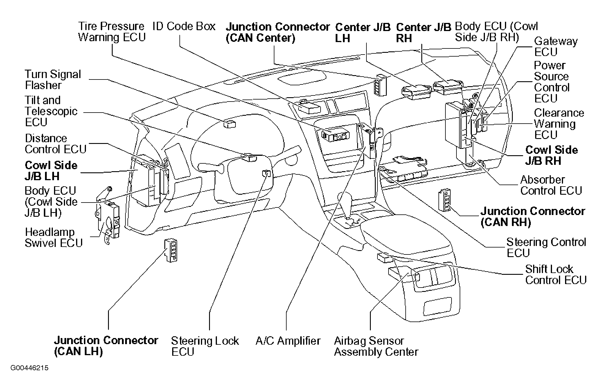 | Cowl Side J/B LH | Behind left end of dash. See Figure. |