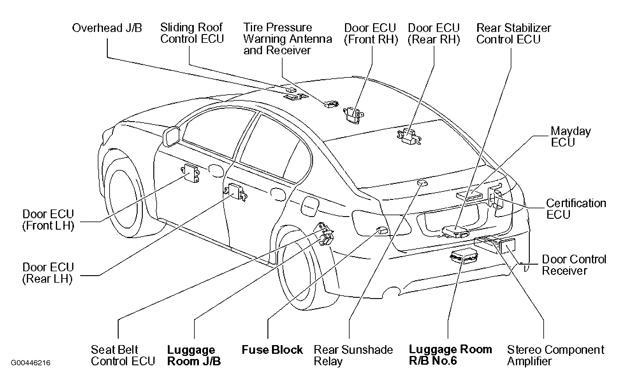 | Luggage Room R/B No. 6 | Center rear of luggage compartment. See Figure. |