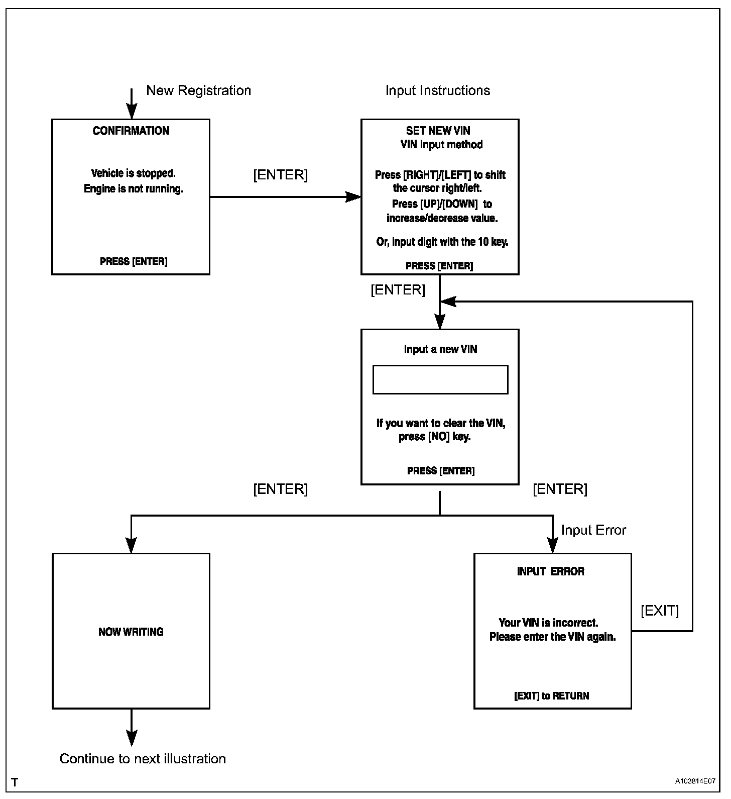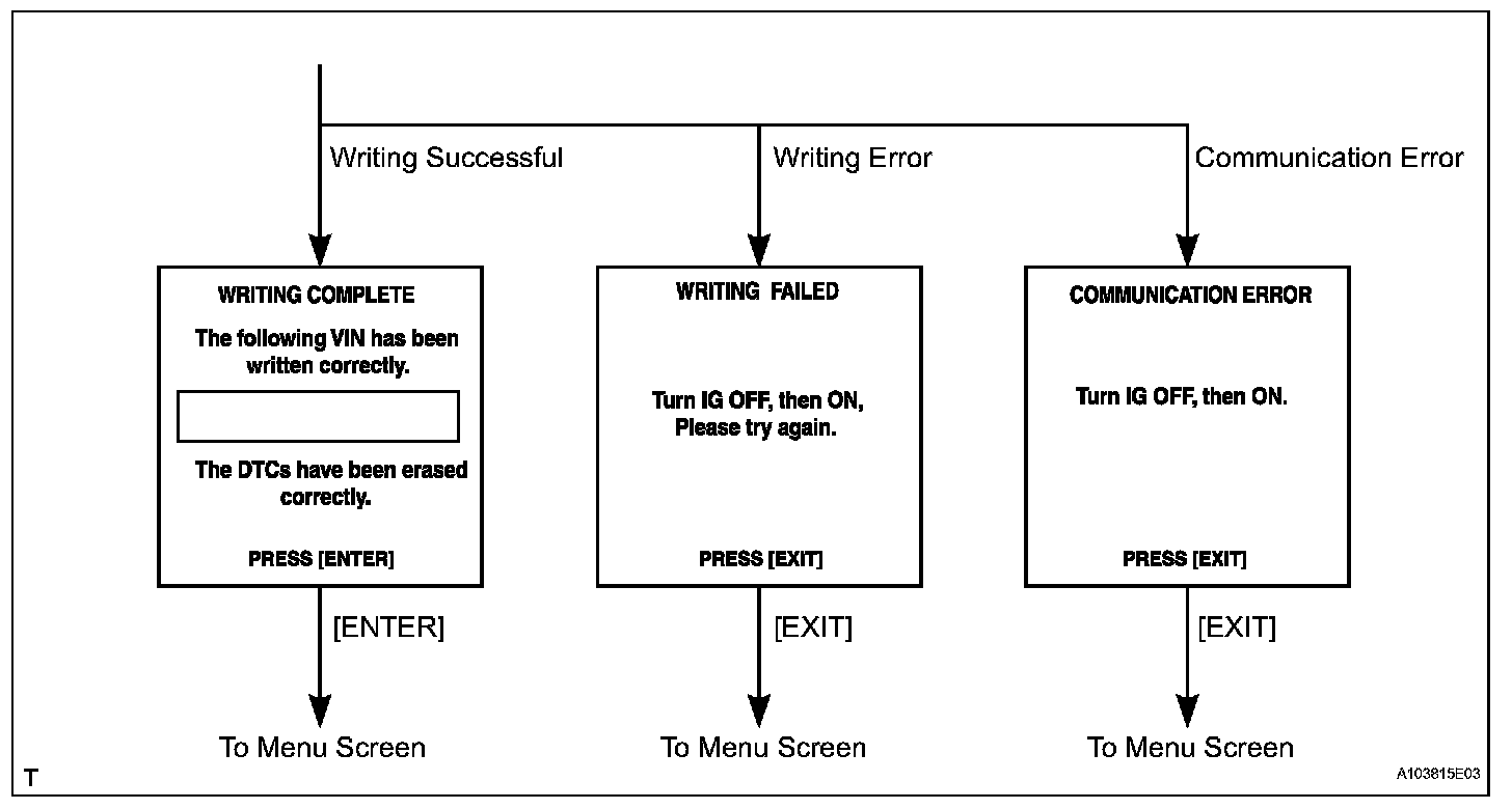 HINT: are the VIN writing instructions. Use the procedures and flowchart. This process allows the VIN to be input into the ECM. If the ECM is changed, or the ECM VIN and Vehicle VIN do not match, the VIN can be registered or overwritten in the ECM by following this procedure.