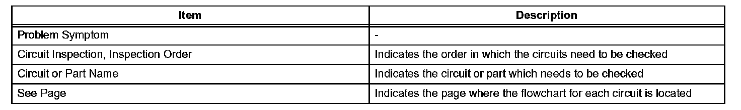 PROBLEM SYMPTOMS TABLEWhen a "Normal" code is output during a DTC check but the problem still occurs, use the Problem Symptoms Table. The suspected areas (circuits or parts) for each problem symptoms are in the table. The suspected areas are listed in order of probability. A description of each of the chart's columns are given.