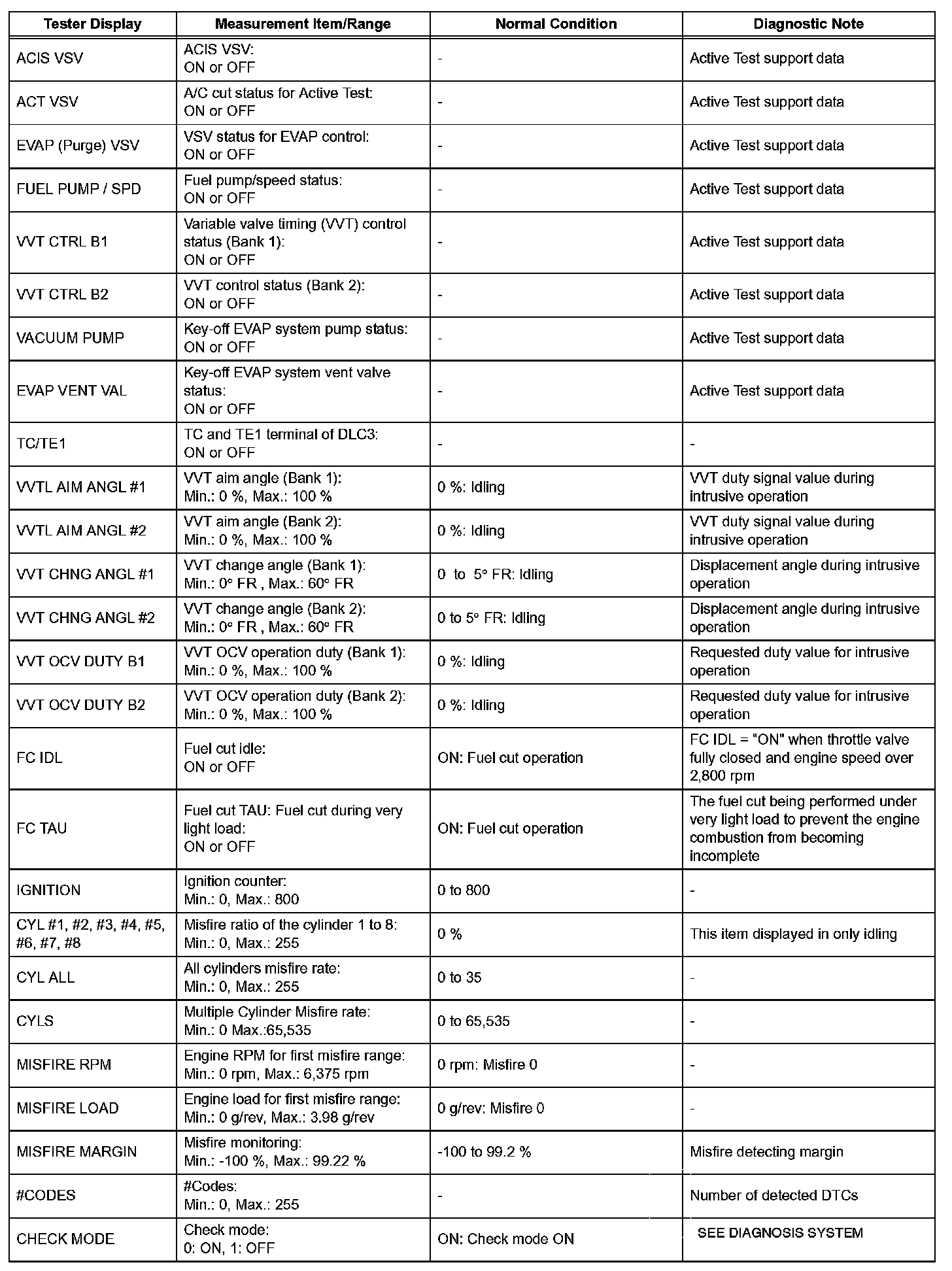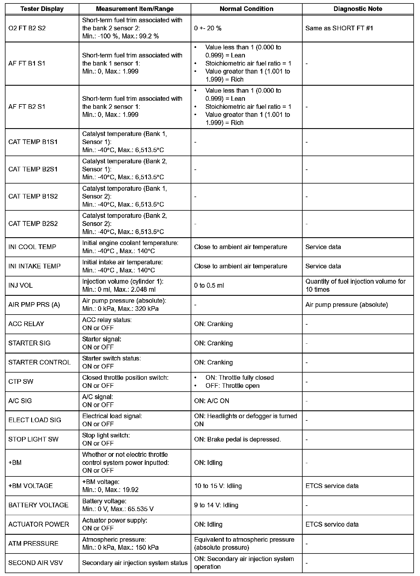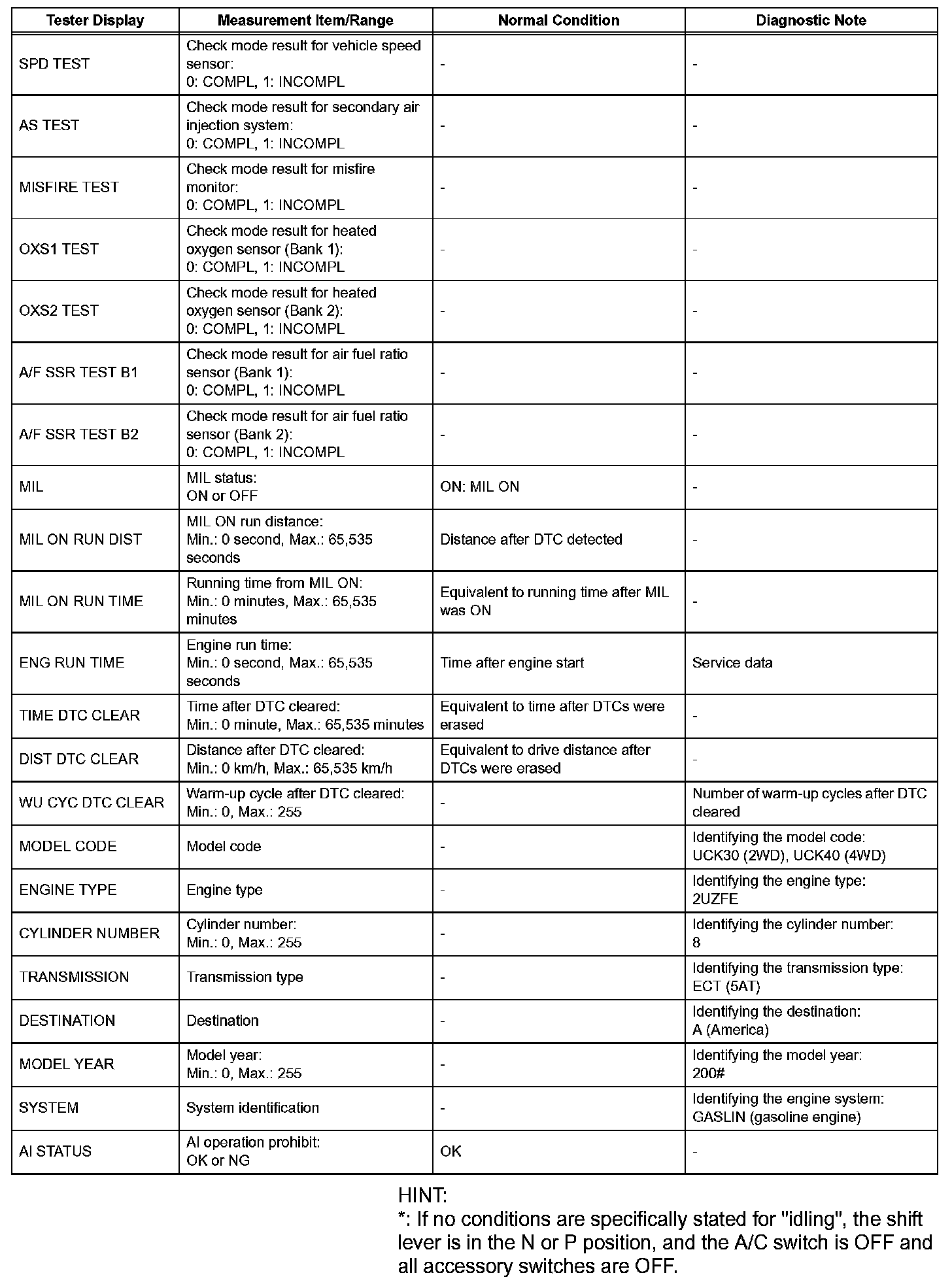 DATA LISTHINT: Using the intelligent tester's DATA LIST allows switch, sensor, actuator and other item values to be read without removing any parts. Reading the DATA LIST early in troubleshooting is one way to save time.