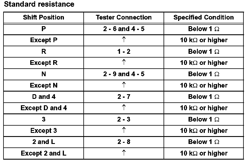 (c) Measure resistance according to the value(s) in the table when the shift lever is moved to each position.