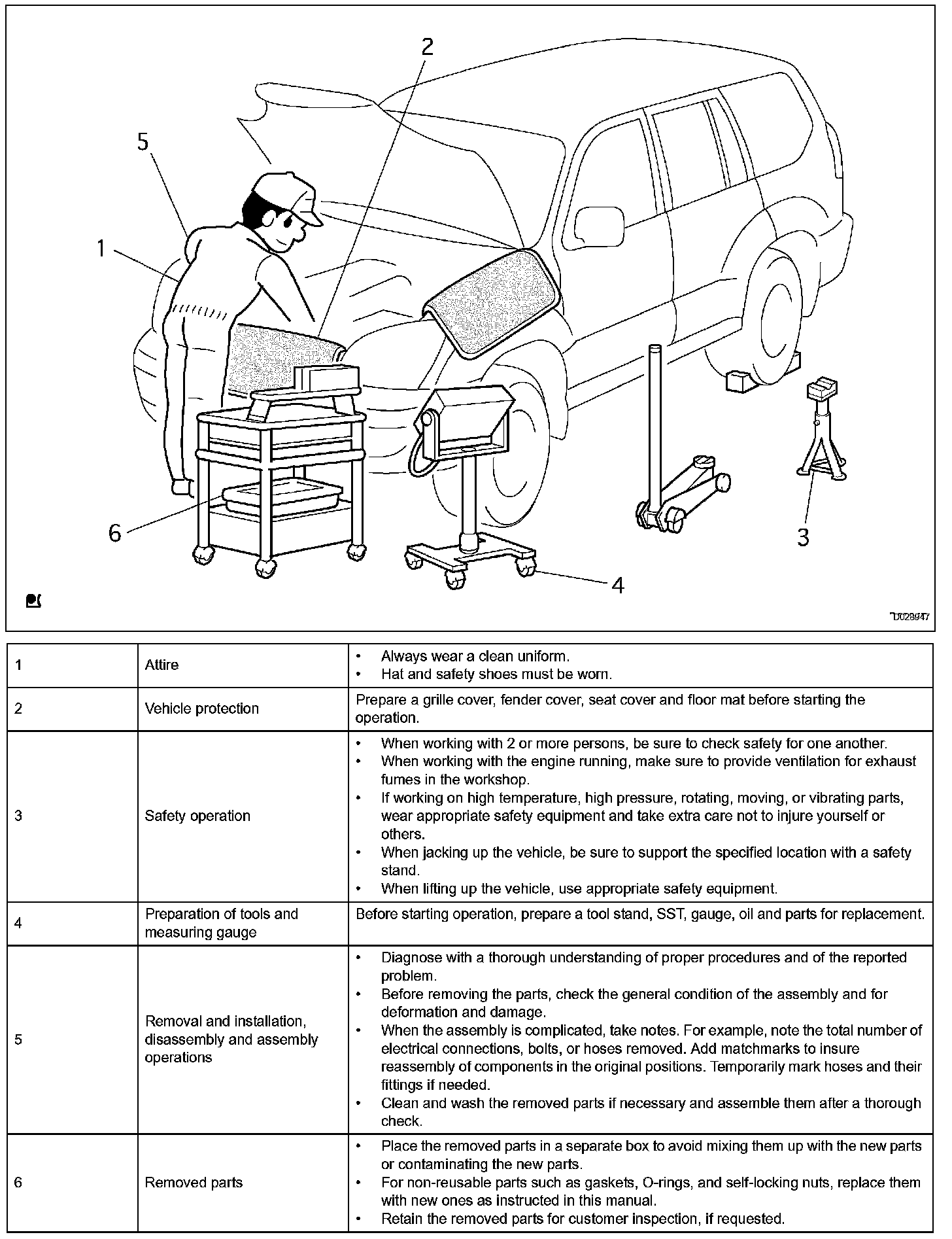 1. Care must be taken when jacking up and supporting the vehicle. Be sure to lift and support the vehicle at the proper locations.