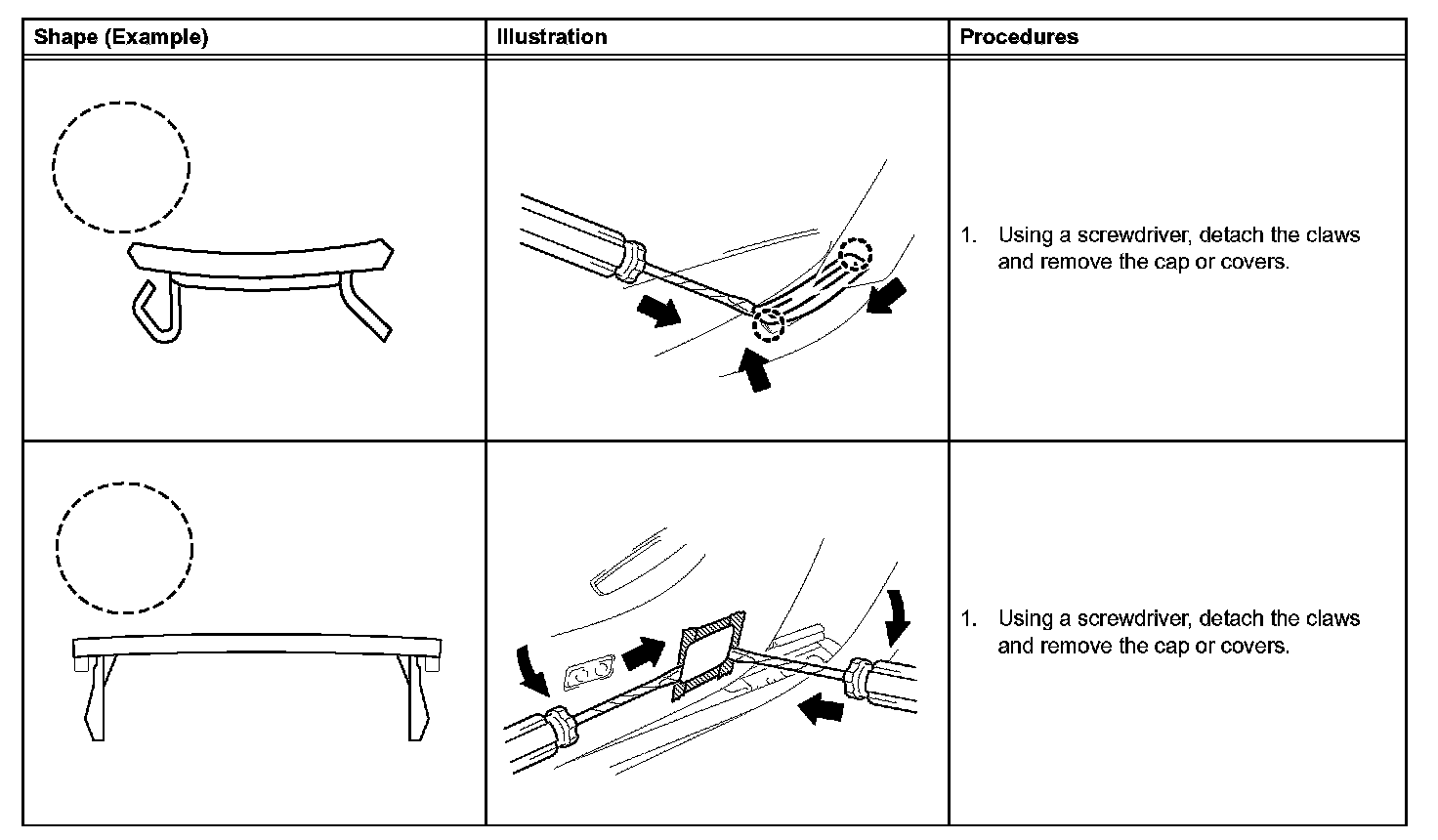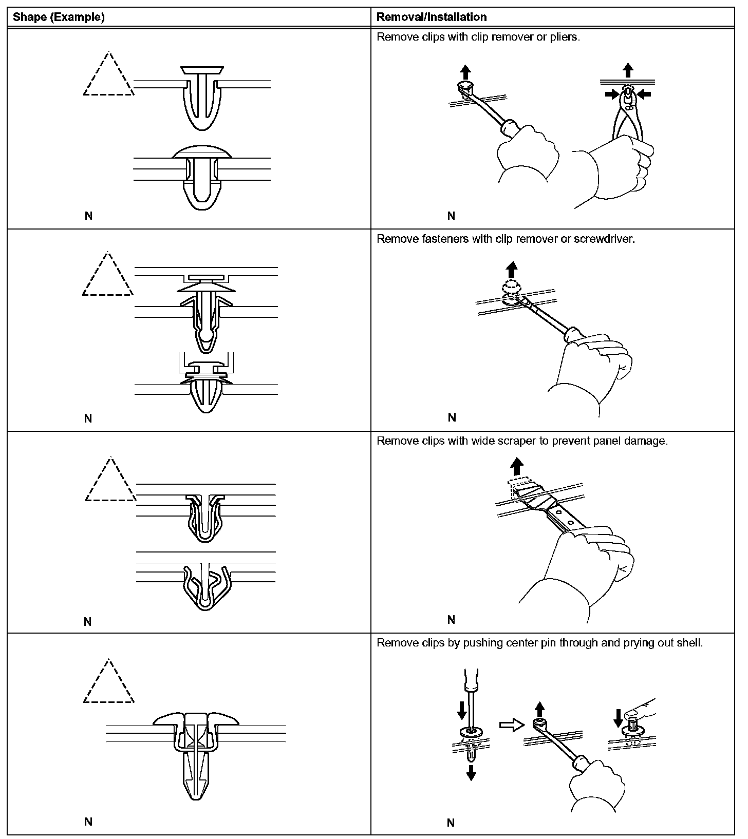 1. The removal and installation methods of typical clips used for vehicle body parts are shown in the table.