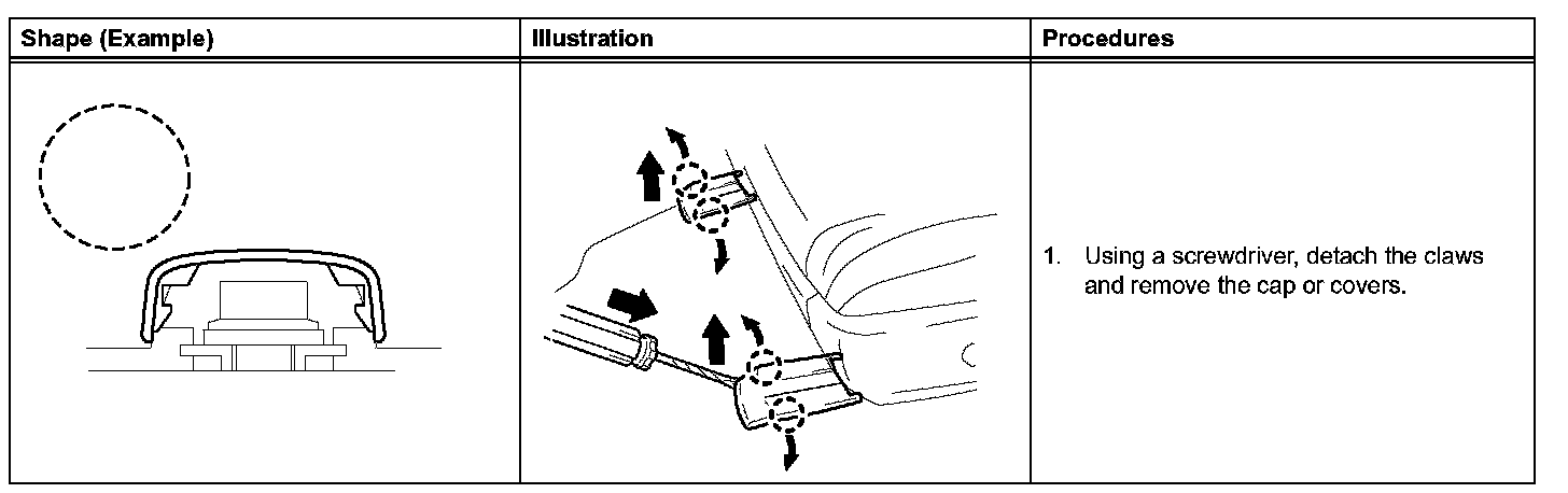 1. The removal and installation methods of typical claws used for vehicle body parts are shown in the table.