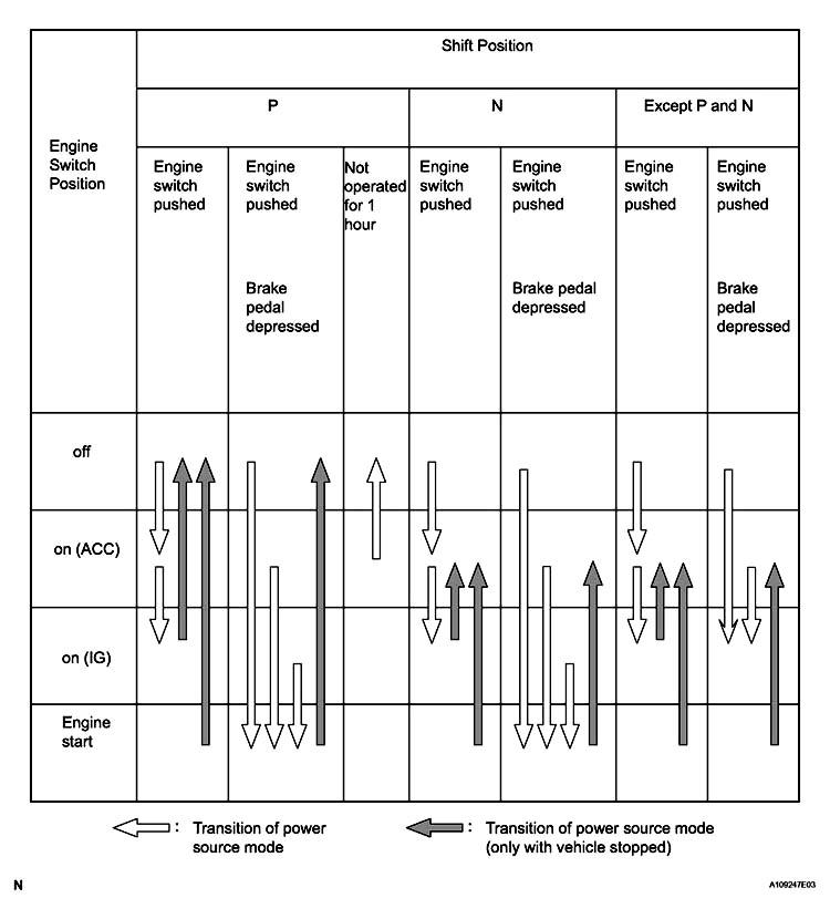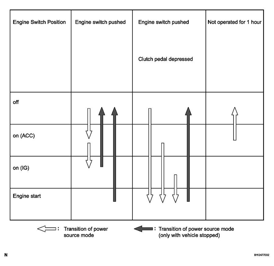 Brake Pedal Shift Lever Power Source Mode Pattern Depressed P or N position When the engine switch is pushed once. - off --> engine start