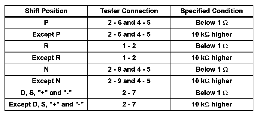 If the resistance value is not as specified, replace the park/neutral position switch assembly.