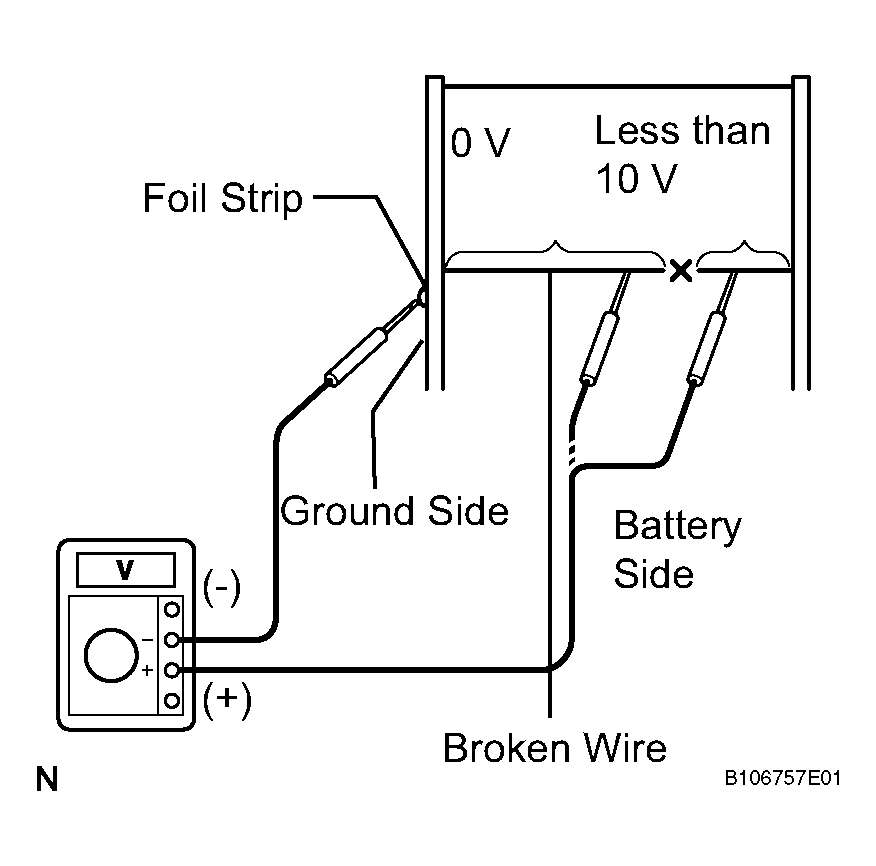 If the defogger wire is not broken, the voltmeter should indicate 0 V at the positive (+) end of the defogger wire but gradually increases to approximately 12 V as the meter probe moves to the other end.