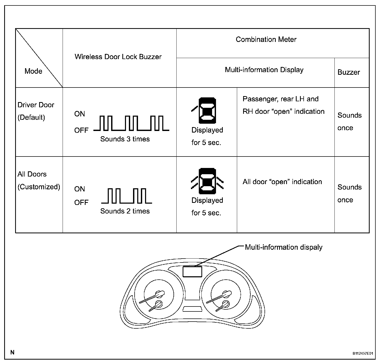 When the switches are pressed and held for 5 seconds, the entry door unlock mode changes in the following order: driver door mode, one door mode, doors on one side mode, all door mode.