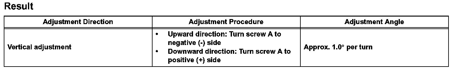 - If "LEFT SIDE: 1.0 °" is displayed, the divergence is 1.0 ° in the left direction. Turn screw B approximately 3 turns to the negative (-) side.