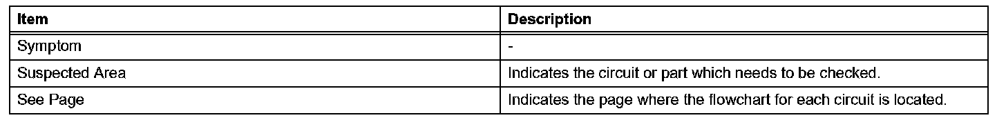 PROBLEM SYMPTOMS TABLEWhen a "Normal" code is output during a DTC check but the problem still occurs, use the Problem Symptoms Table. The suspected areas (circuits or parts) for each problem symptoms are in the table. The suspected areas are listed in order of probability. A description of each of the chart's columns is shown in the table.