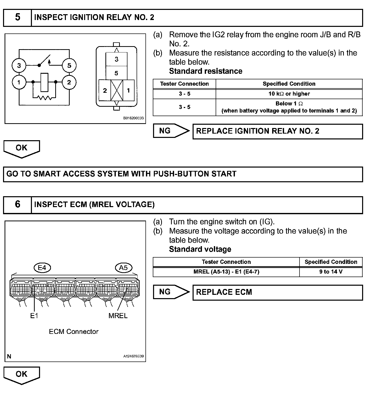 When the engine switch is turned on (IG), the battery voltage is applied to terminal IGSW of the ECM. The ECM MREL output signal causes a current to flow to the coil, closing the contacts of the EFI MAIN relay and supplying power to terminal +B of the ECM.