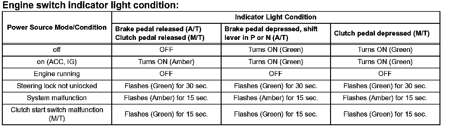 - The amber and green LEDs are for the indicator lights. The driver can check the present power source mode and whether the engine can start in accordance with the illumination state of the indicator light.