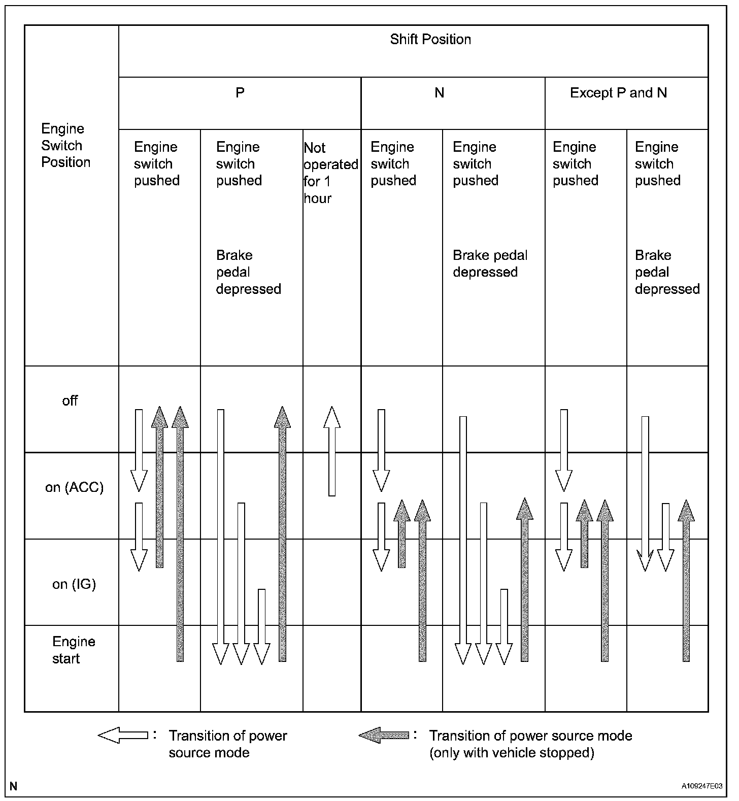 HINT: While the vehicle is being driven normally, operation of the engine switch is disabled. However, if the engine must be stopped in an emergency while the vehicle is being driven, pressing the engine switch for 3 seconds or more stops the engine. Power source mode changes from start to on (ACC).
