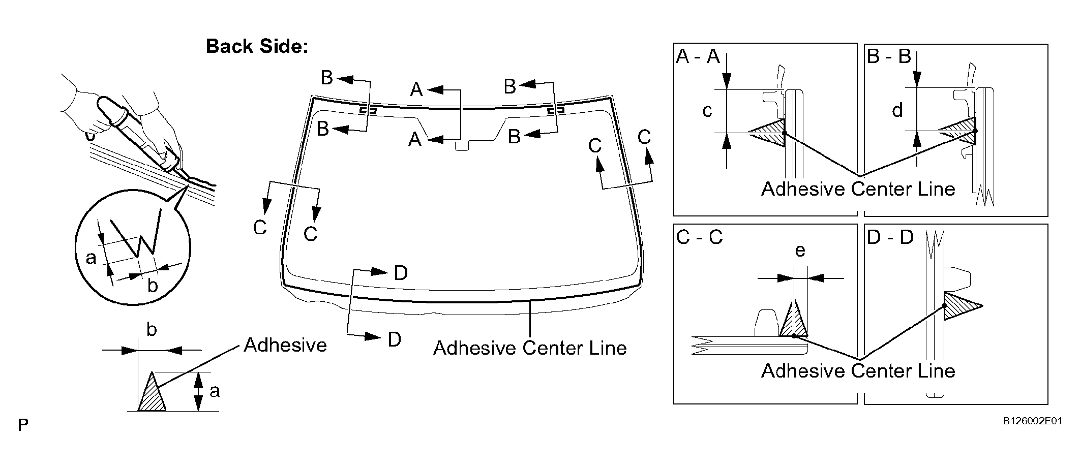 WINDSHIELD GLASS ADHESIVE DAM STANDARD DIMENSION TABLEArea Dimension a 9.5 mm (0.374 in.) - Coat the installation part of the dam with Primer G.