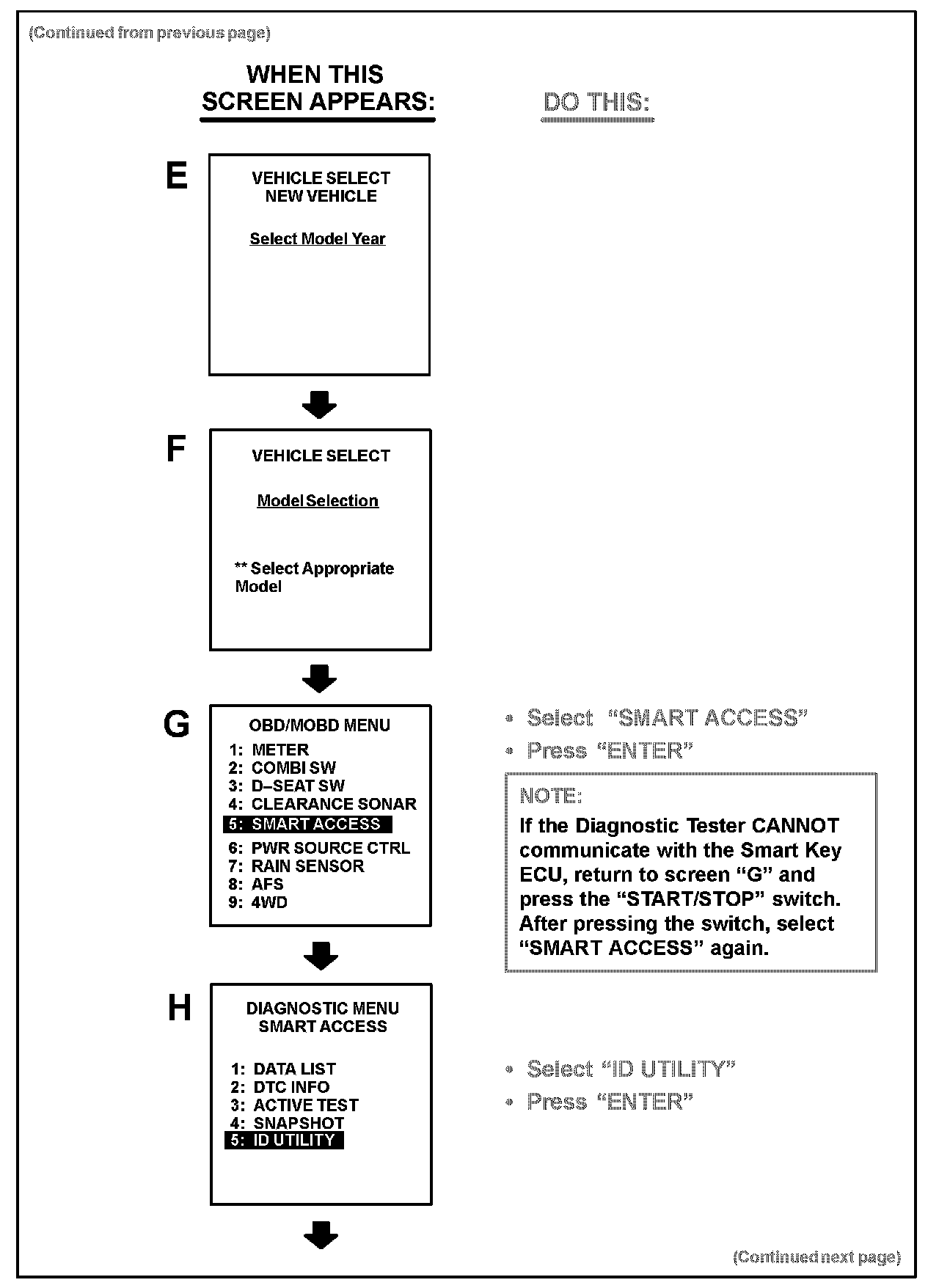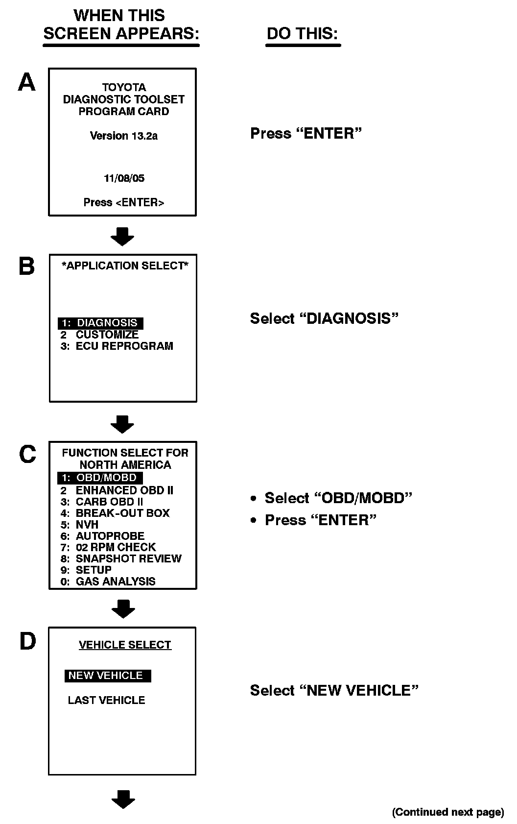 Follow the Diagnostic Tester screen flows. This procedure works best if you use the instructions under the "DO THIS" column and use the screen prints to know WHEN to perform the instructions only.