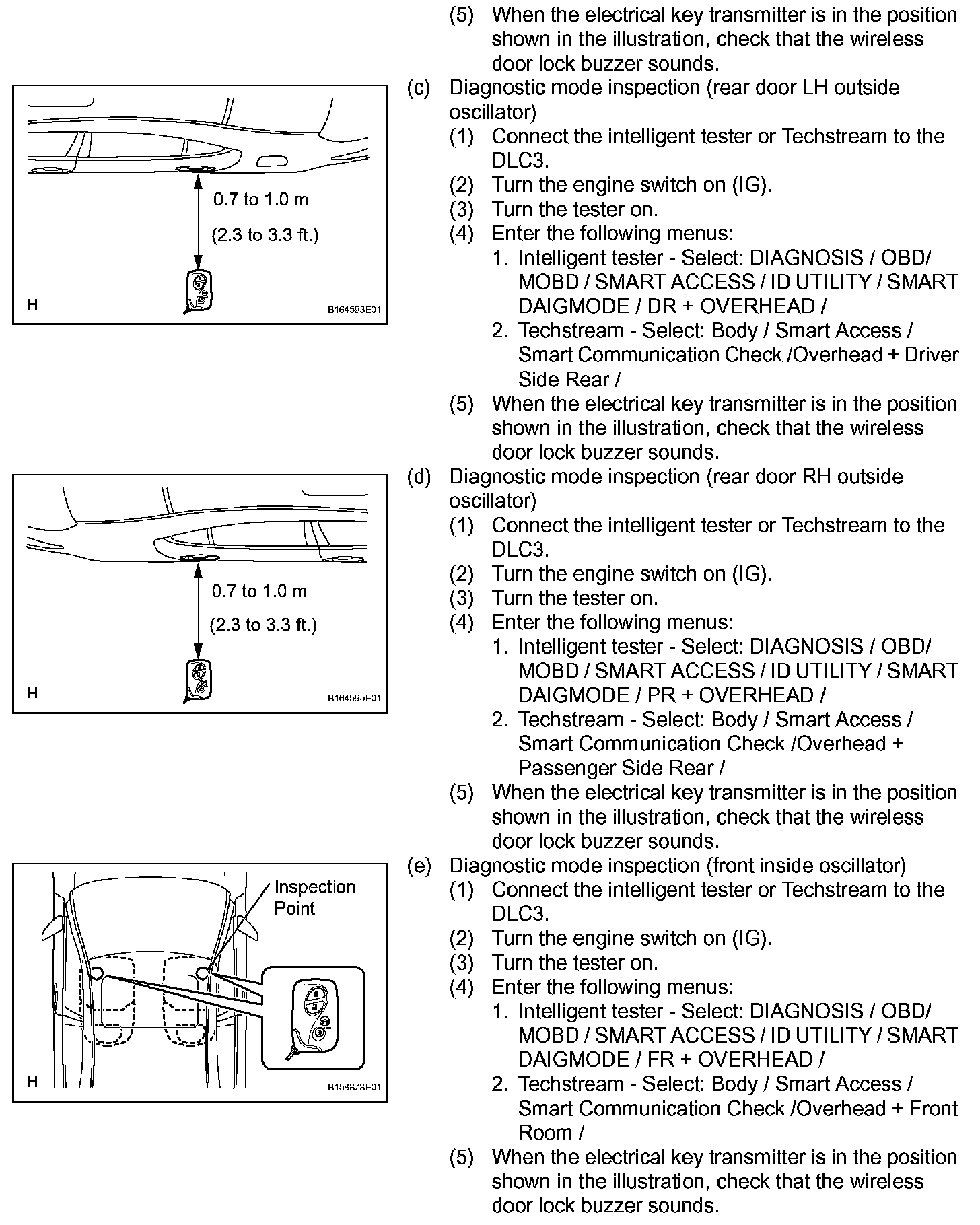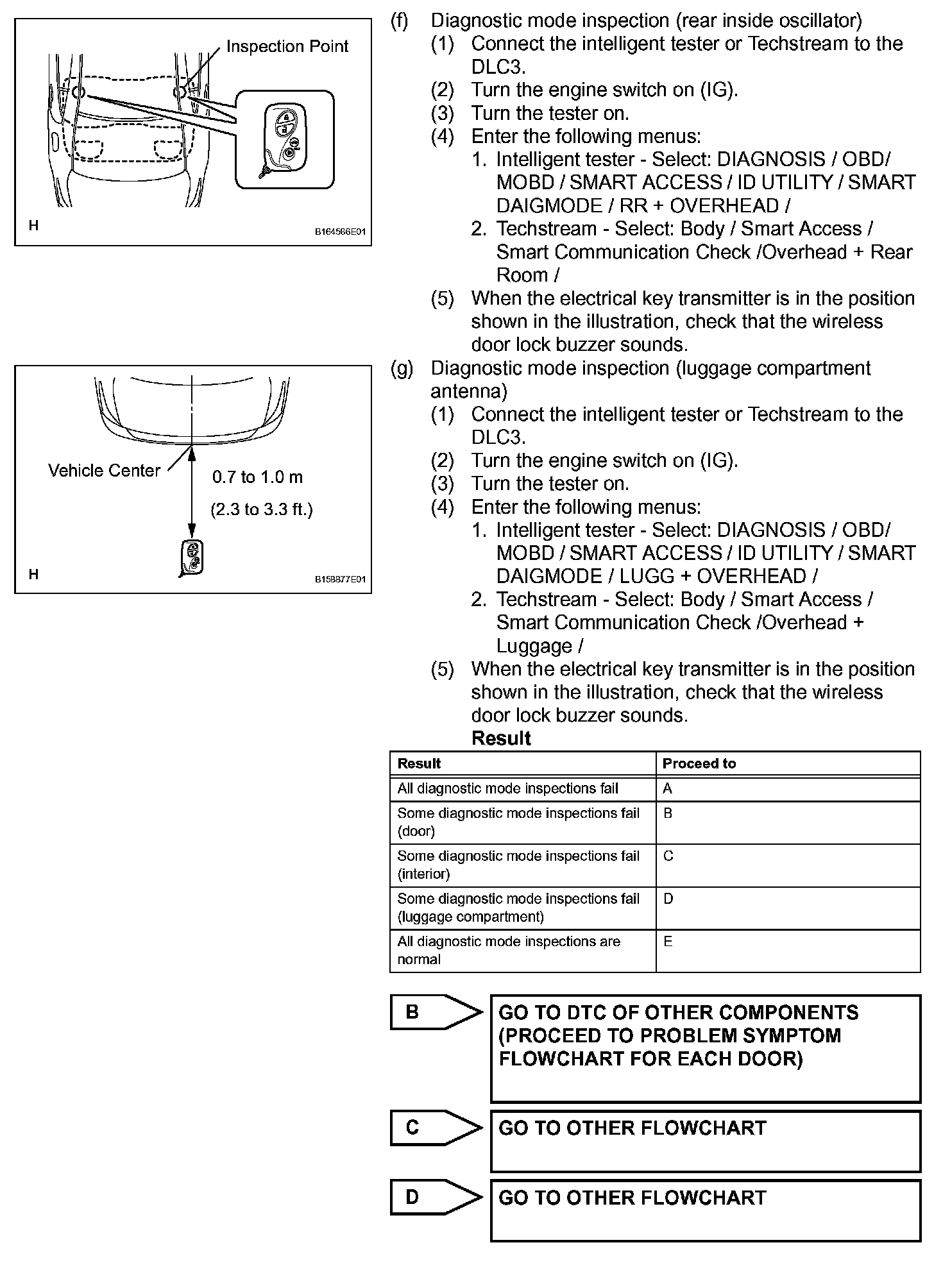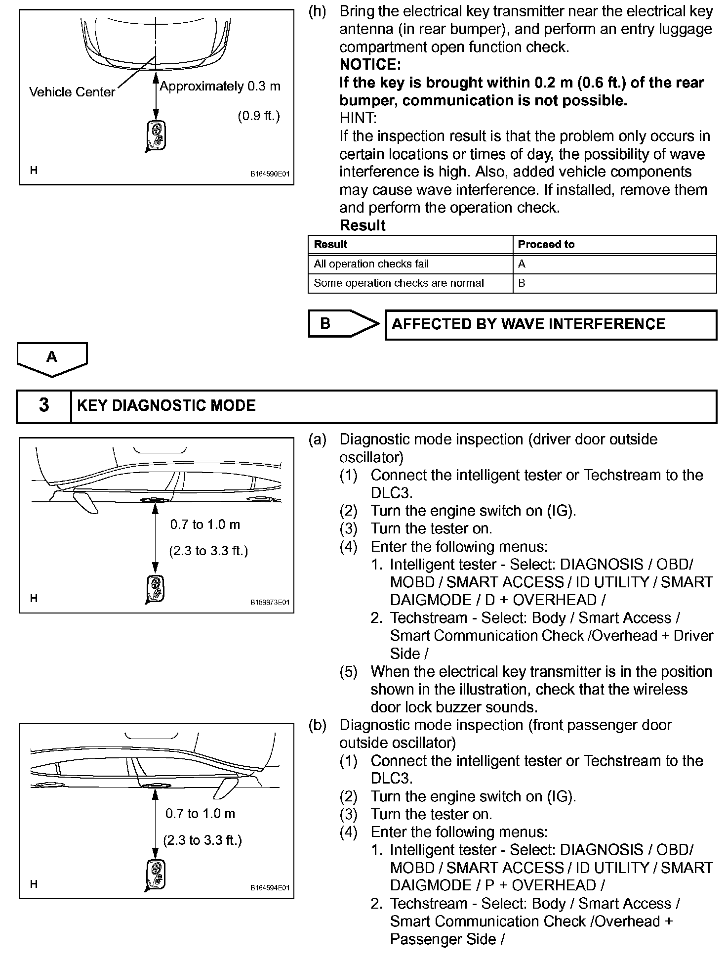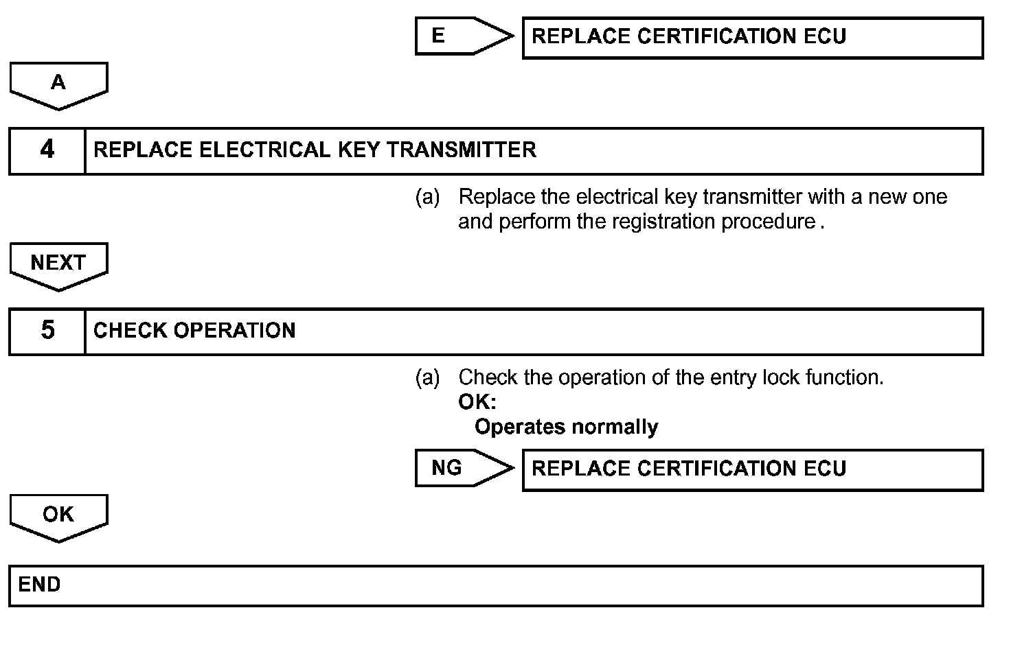 When the wireless operation can be used to lock and unlock the doors, the communication line between the door control receiver and certification ECU is normal. When the entry operation does not operate, one of the following may be the cause: 1) entry cancel function is set through customization; 2) malfunction in smart access system communication line (electrical key transmitter and vehicle); or 3) wave interference.