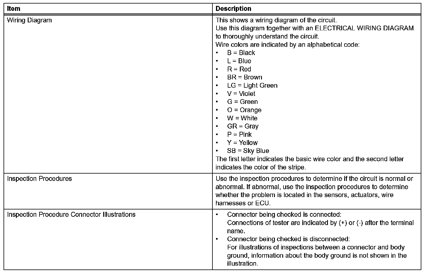 A description of the main areas of each circuit inspection.
