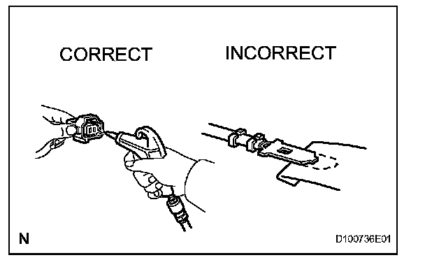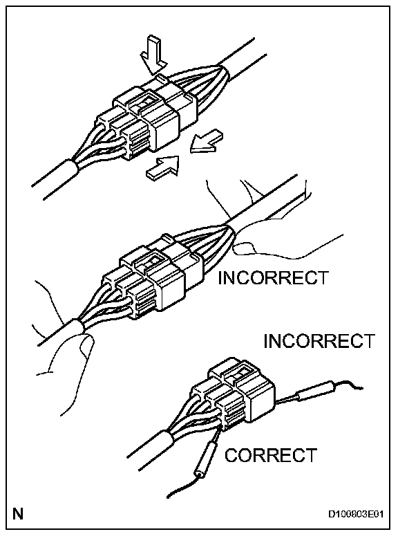 5. If checking a connector with a TOYOTA electrical tester, check the connector from the backside (harness side) using a mini test lead.