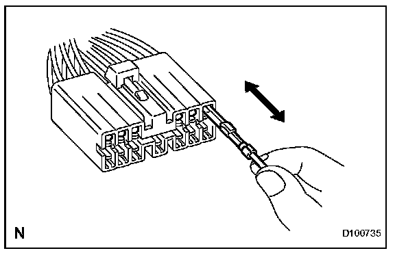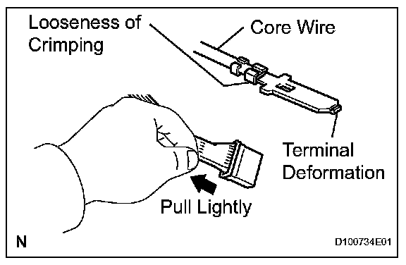 Check by pulling the wire harness lightly from the backside of the connector. Look for unlatched terminals, missing terminals, loose crimps or broken conductor wires. Check visually for corrosion, metallic or foreign matter and water, and bent, rusted, overheated, contaminated, or deformed terminals.