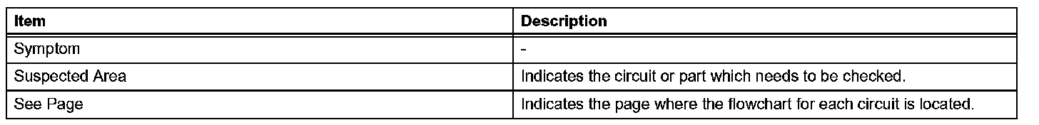 When a "Normal" code is output during a DTC check but the problem is still occurring, use the Problem Symptoms Table. The suspected areas (circuits or parts) for each problem symptom are in the table. The suspected areas are listed in order of probability. A description of each of the chart's columns.