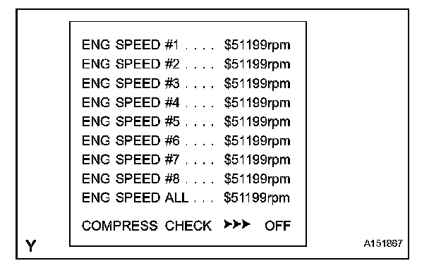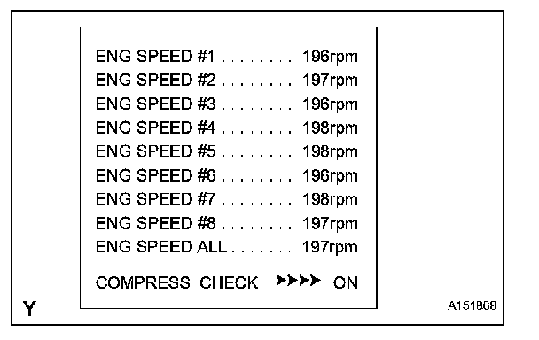 HINT: If the results are not displayed normally, select the display items from the Data List before performing the Active Test. Enter the following menus: Powertrain / Engine / Data List / Compression / Engine Speed of Cyl #1, Engine Speed of Cyl #2, Engine Speed of Cyl #3, Engine Speed of Cyl #4, Engine Speed of Cyl #5, Engine Speed of Cyl #6, Engine Speed of Cyl #7, Engine Speed of Cyl #8 and Av Engine Speed of All Cyl.