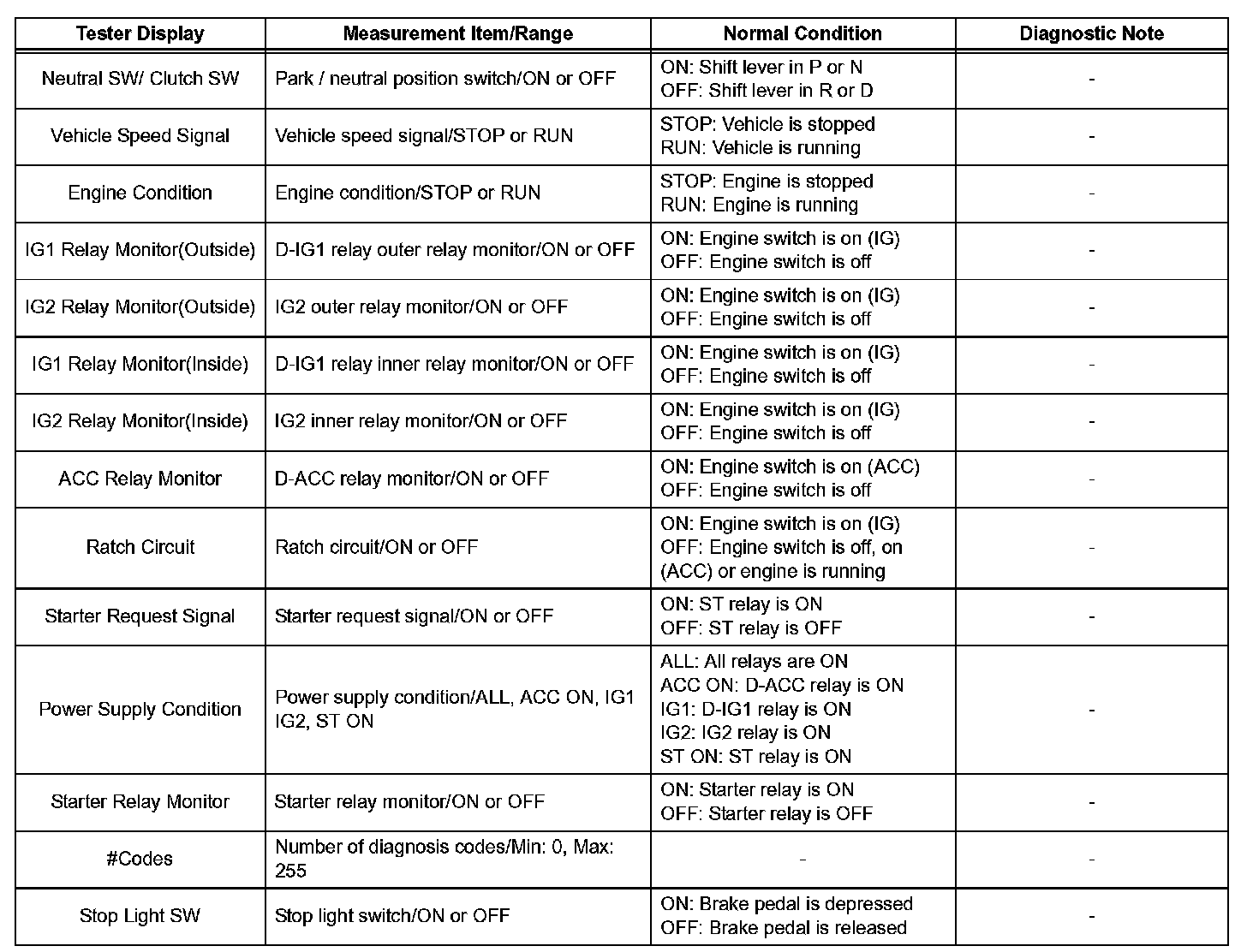 READ DATA LISTHINT: Using the intelligent tester or Techstream to read the Data List allows the values or states of switches, sensors, actuators and other items to be read without removing any parts. This non-intrusive inspection can be very useful because intermittent conditions or signals may be discovered before parts or wiring is disturbed. Reading the Data List information early in troubleshooting is one way to save diagnostic time.