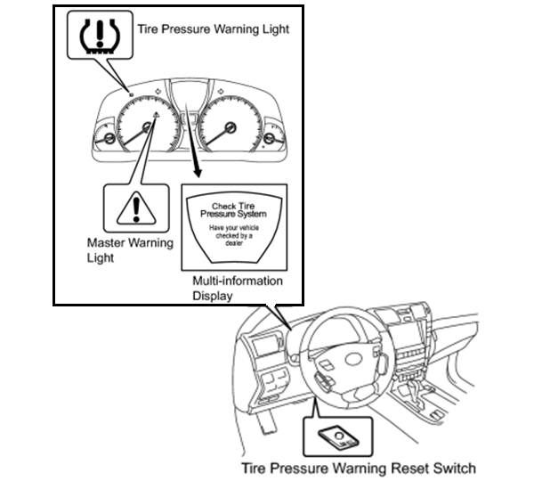 4. Press and hold the tire pressure warning reset switch for at least 3 seconds. The tire pressure warning light will flash 3 times and a message will be shown on the multi-information display to indicate that initialization has started. See Fig 1.