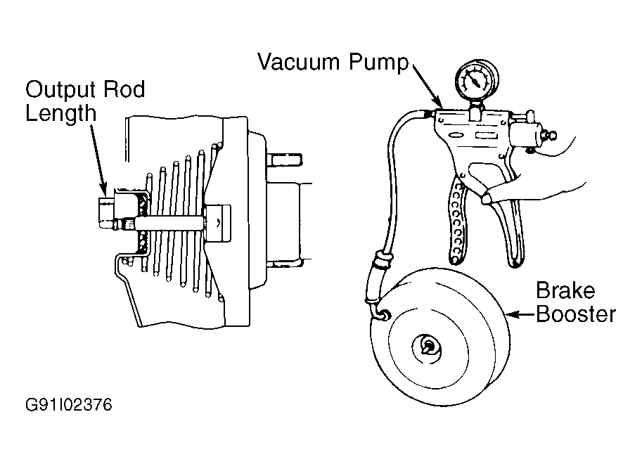 With master cylinder removed, apply 19.69 in. Hg vacuum and measure output rod length. Specified length is .614-.626 in. (15.6-15.9 mm). See Fig 1.