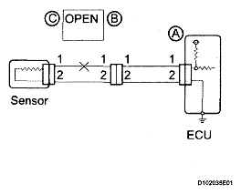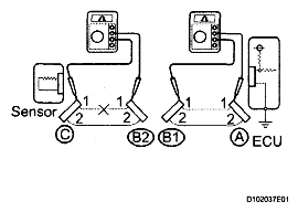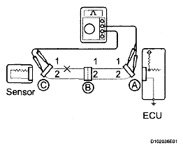 If the results match the examples above, an open circuit exists in the wire harness between terminal 1 of connector B and terminal 1 of connector C.