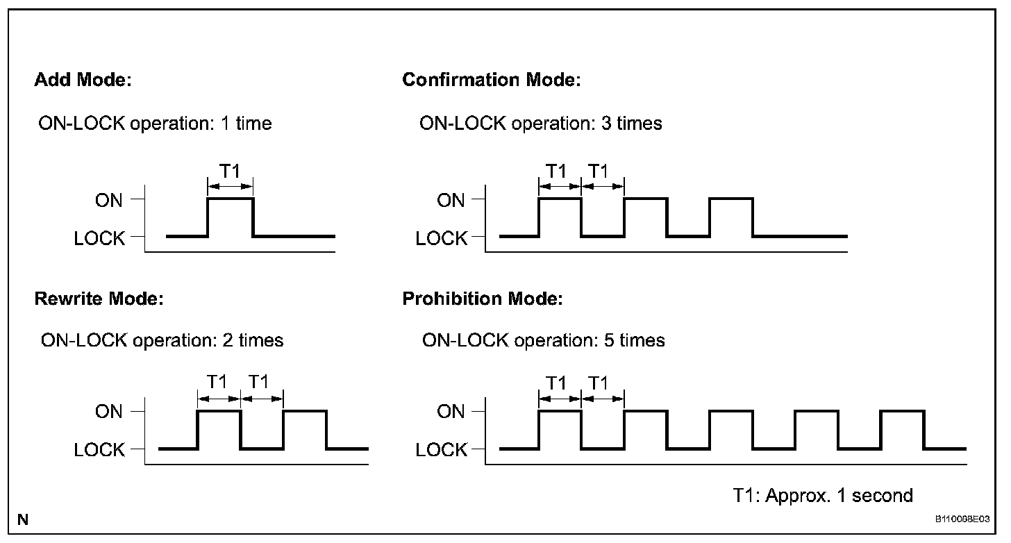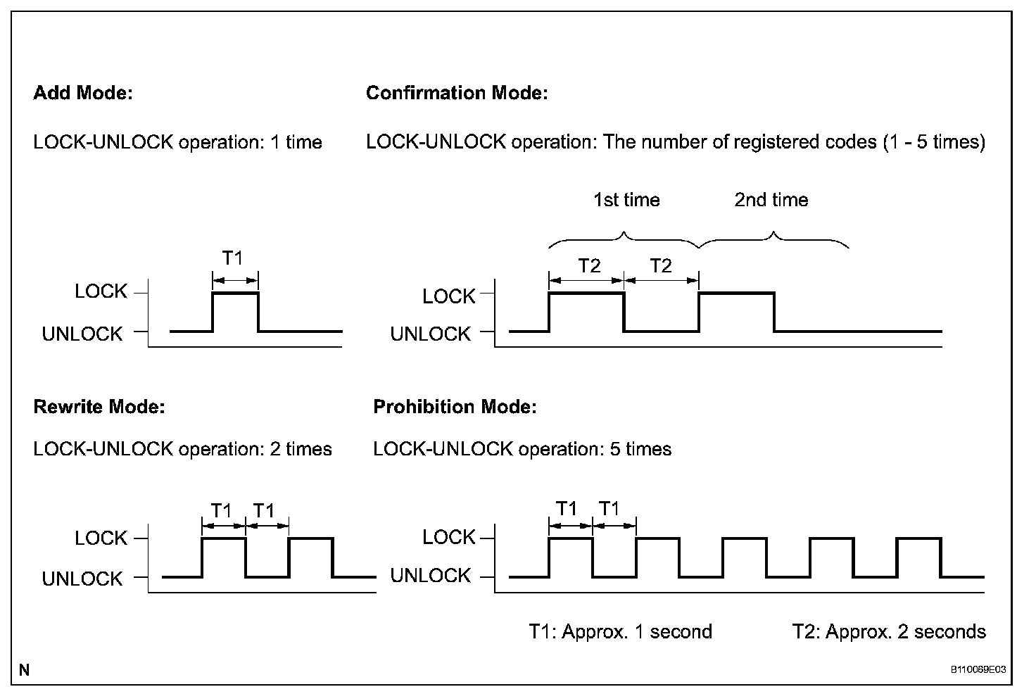 - Add mode is used to register new recognition codes while still retaining codes already registered. This mode is used when a new transmitter is added. If the number of registered codes exceeds 4, the previously registered codes will be erased in order, starting from the first registered code.