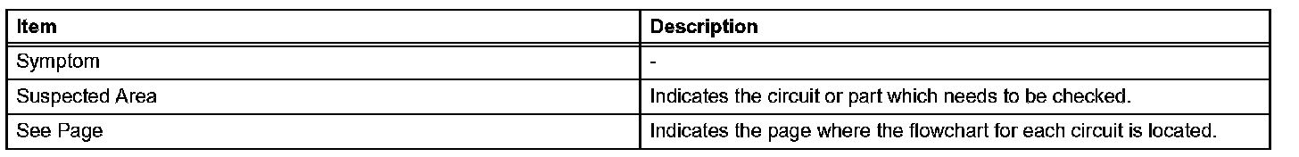 PROBLEM SYMPTOMS TABLEWhen a "Normal" code is output during a DTC check but the problem is still occurring, use the Problem Symptoms Table. The suspected areas (circuits or parts) for each problem symptom are in the table. The suspected areas are listed in order of probability. A description of each of the chart's columns.