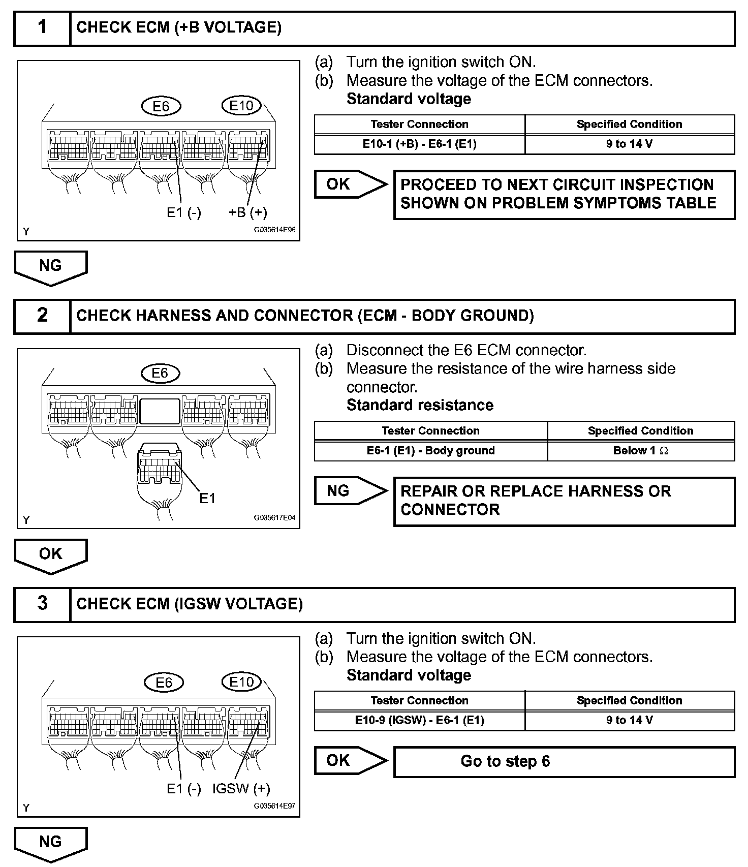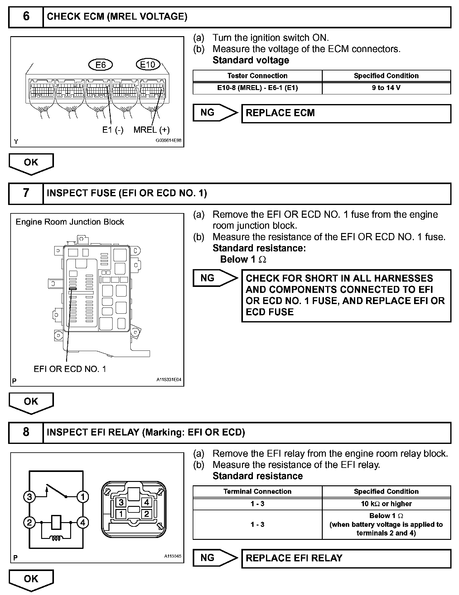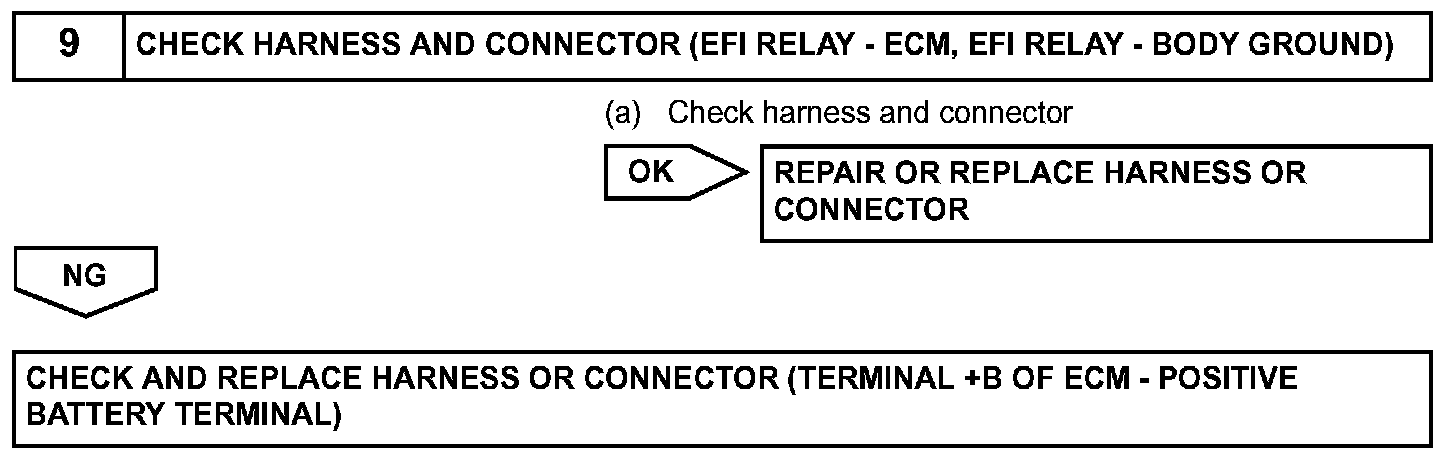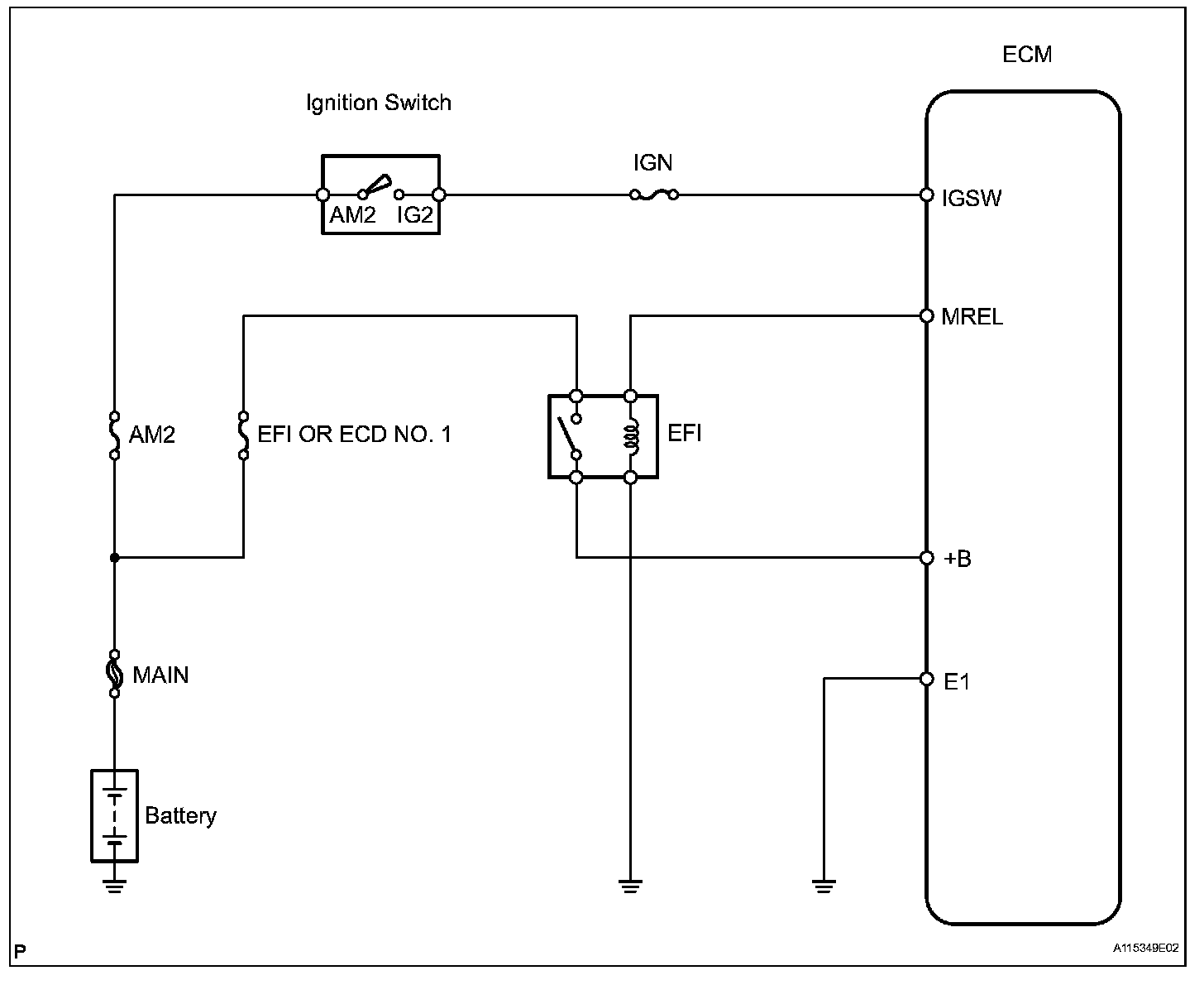 This signal causes current to flow to the coil, closing the contacts of the EFI relay and supplying power to terminal +B of the ECM.