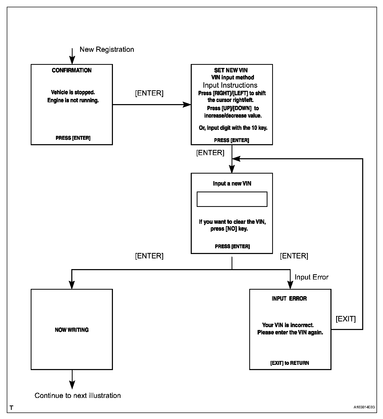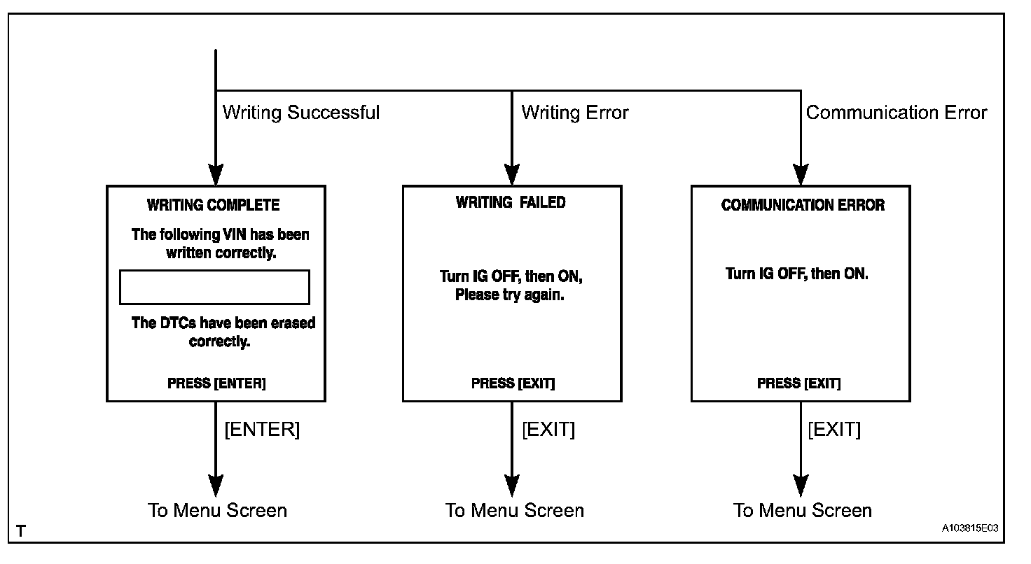 HINT: The VIN writing instructions. Use the procedures and flowchart. This process allows the VIN to be input into the ECM. If the ECM is changed, or the ECM VIN and Vehicle VIN do not match, the VIN can be registered or overwritten in the ECM by following this procedure.