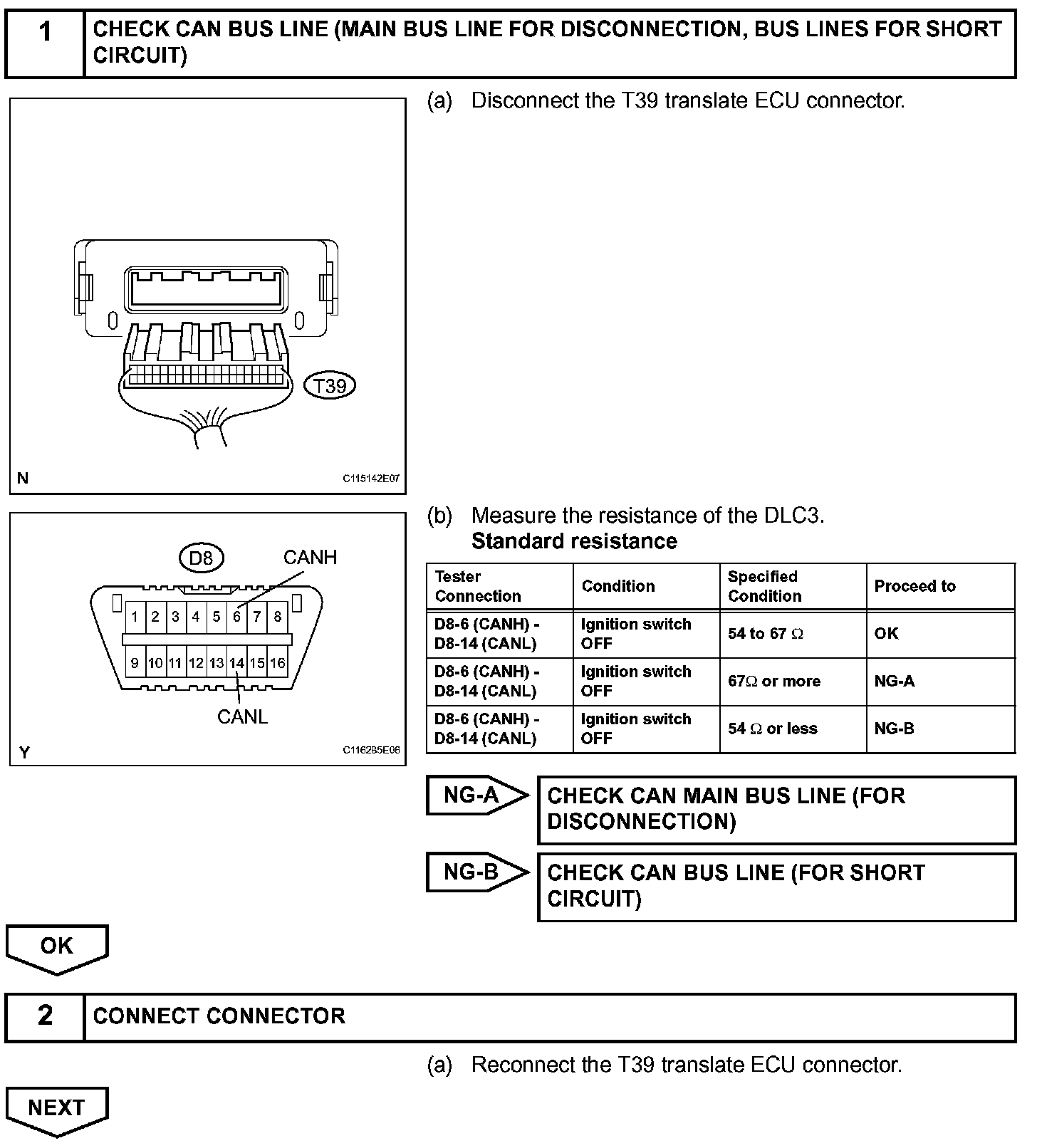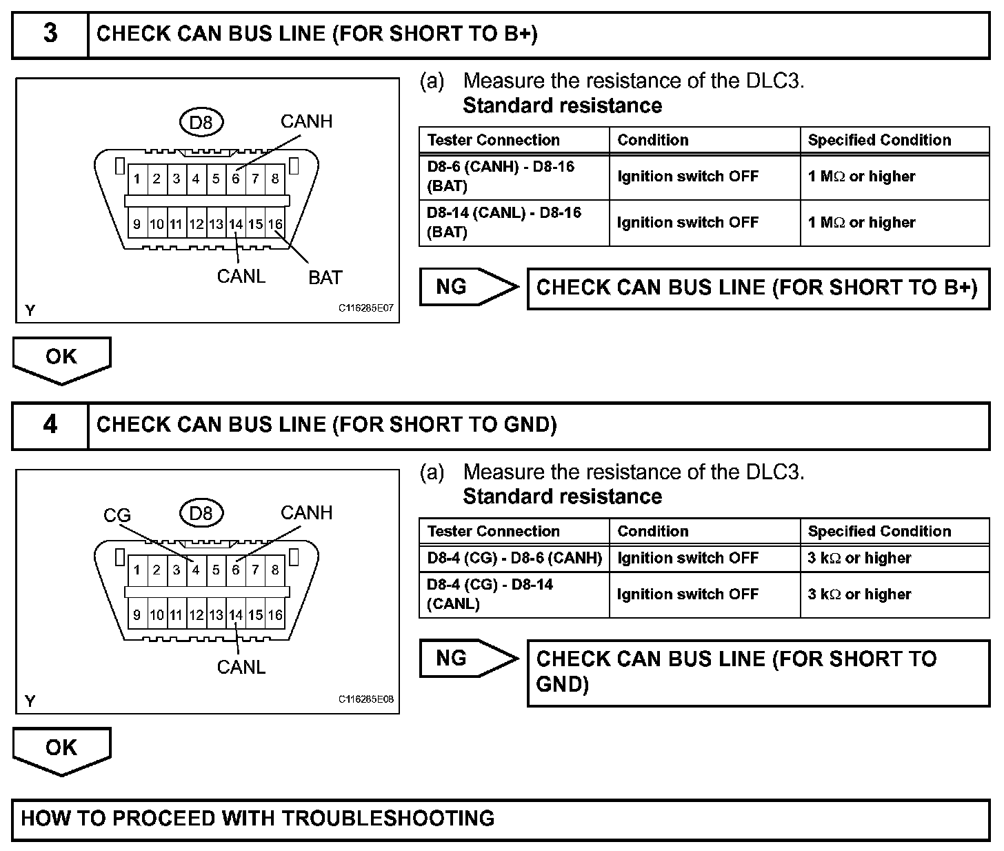 When any DTC for the CAN communication system is output, first measure the resistance between the terminals of the DLC3 to specify the trouble area, and check that there is no short in the CAN main bus line, between the CAN bus lines, to B+, or to GND.