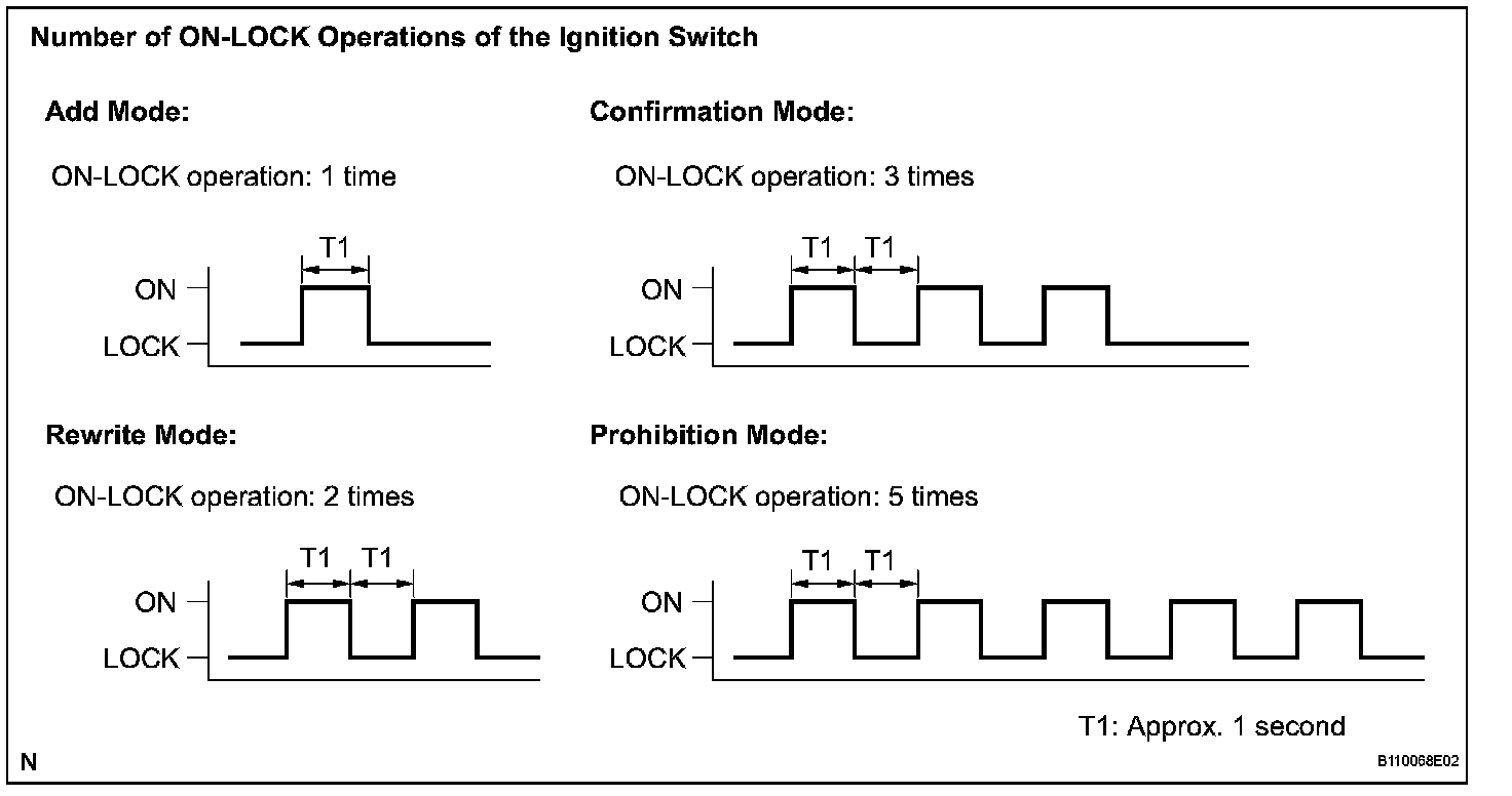 HINT: If the number of ON-LOCK operations of the ignition switch is 0, 4 or 6 or more, there will no response (power door lock and unlock operation) to show which mode has been selected.