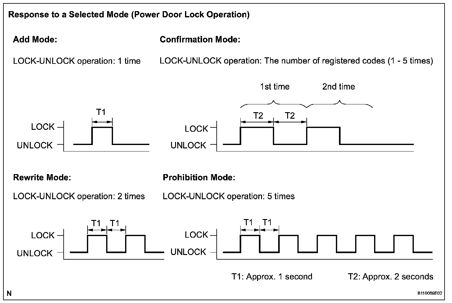 8. The body ECU automatically performs the power door LOCK-UNLOCK operation with in 3 seconds after the mode has been selected and informs the technician of the selected mode using the response patterns as given in the illustration.