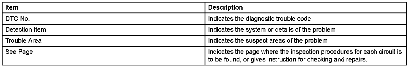 Look for output Diagnostic Trouble Codes (DTCs) (from the DTC checks) in the appropriate section's Diagnostic Trouble Code Chart. Use the chart to determine the trouble area and the proper inspection procedure. A description of each of the chart's columns is shown in the table.